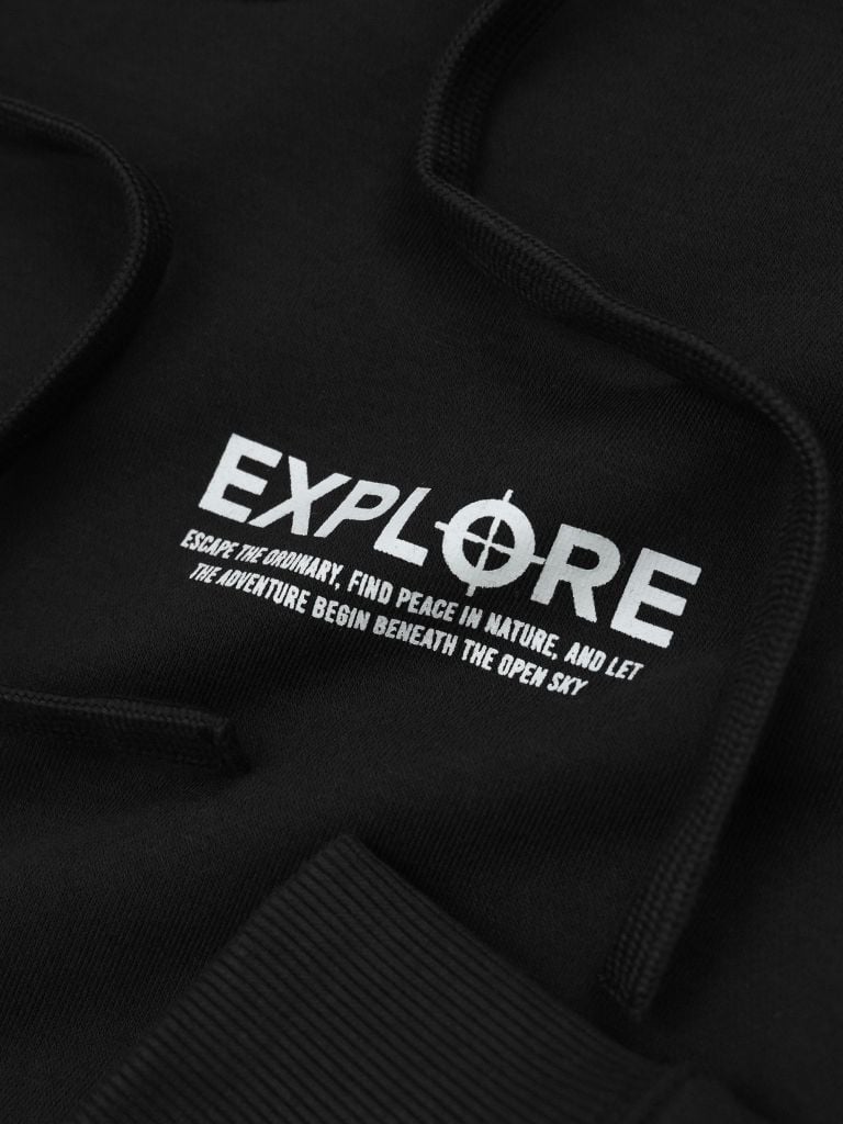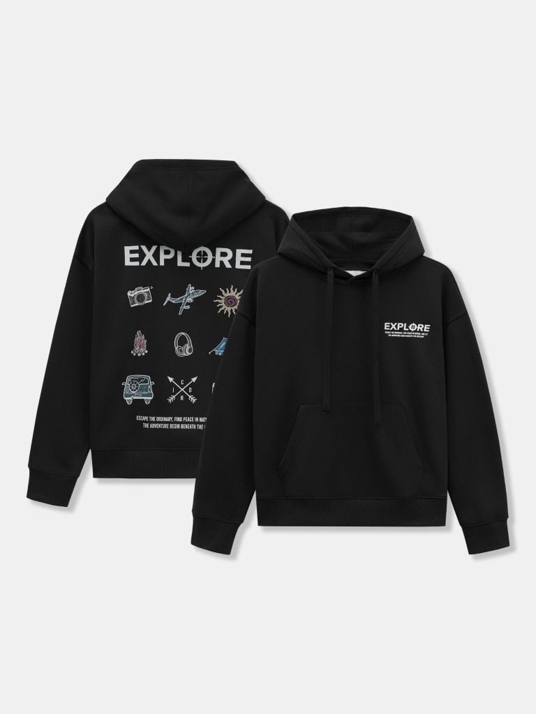 Áo hoodie nổi bật với họa tiết in đặc trưng ở ngực và lưng, mô phỏng biểu tượng hành trình khám phá đúng tinh thần “Explore the Unknown” của ICONDENIM. Phần mũ trùm liền thân, dây rút điều chỉnh và túi kangaroo lớn phía trước giúp tăng tính ứng dụng và tiện lợi khi sử dụng.
