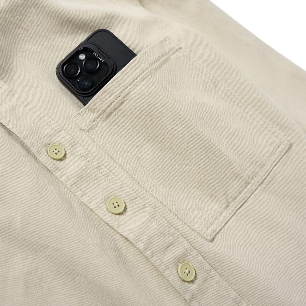 Chi tiết túi hộp 2 bên ngực may nắp đậy tỉ mỉ tạo điểm nhấn tinh tế cho tổng thể. Đường cắt gọn gàng, cổ áo bản lớn 2cm, tay dài có manchette xếp ly tiện dụng khi gập tay.