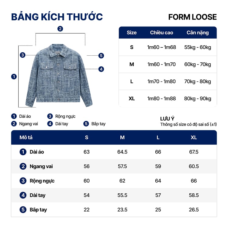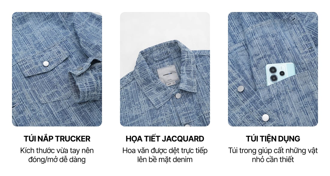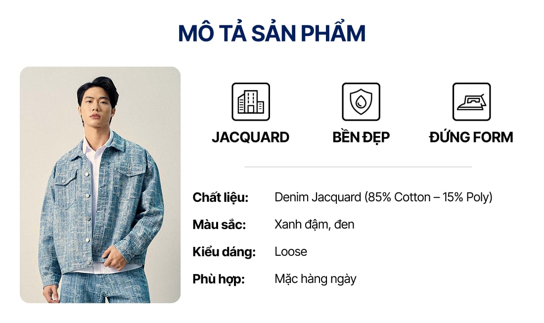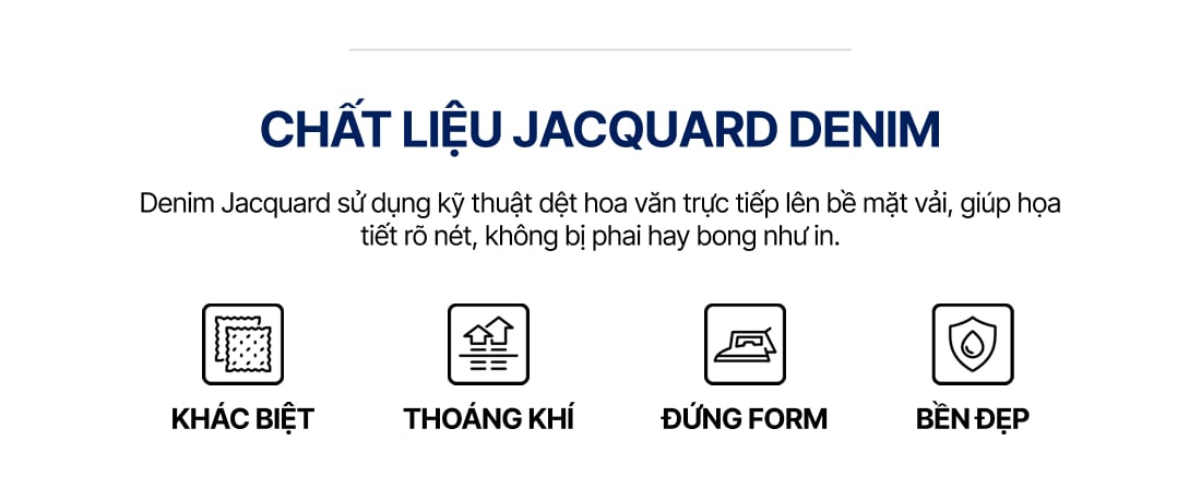 • Chất liệu: Denim Jacquard (85% cotton, 15% polyester)