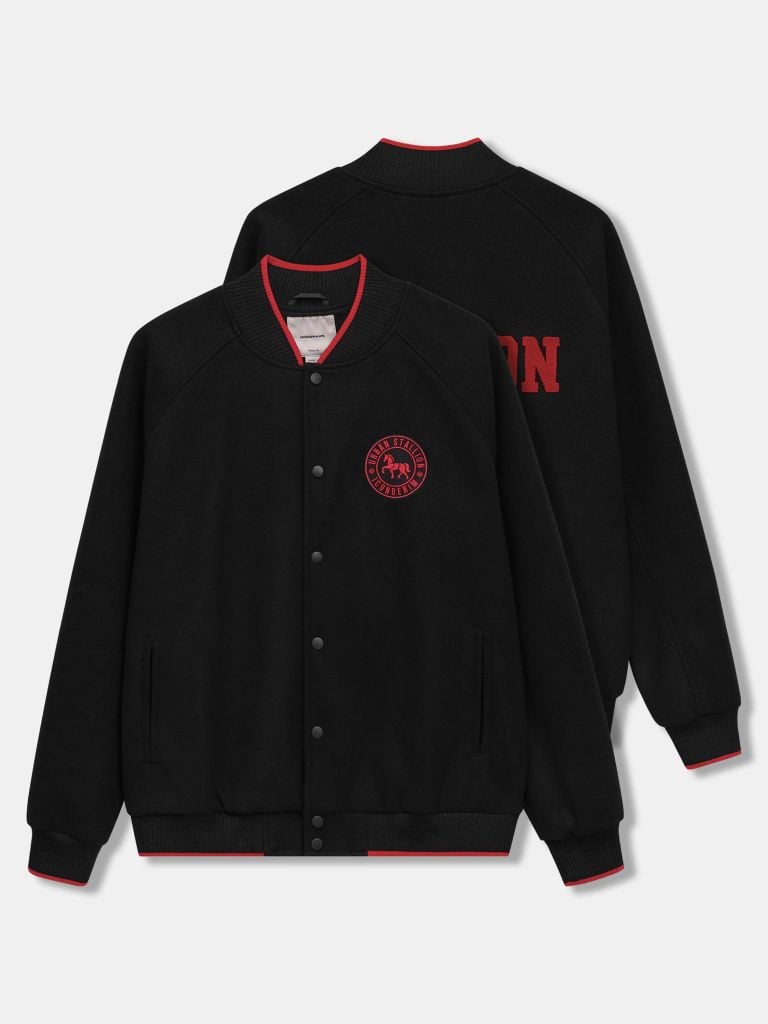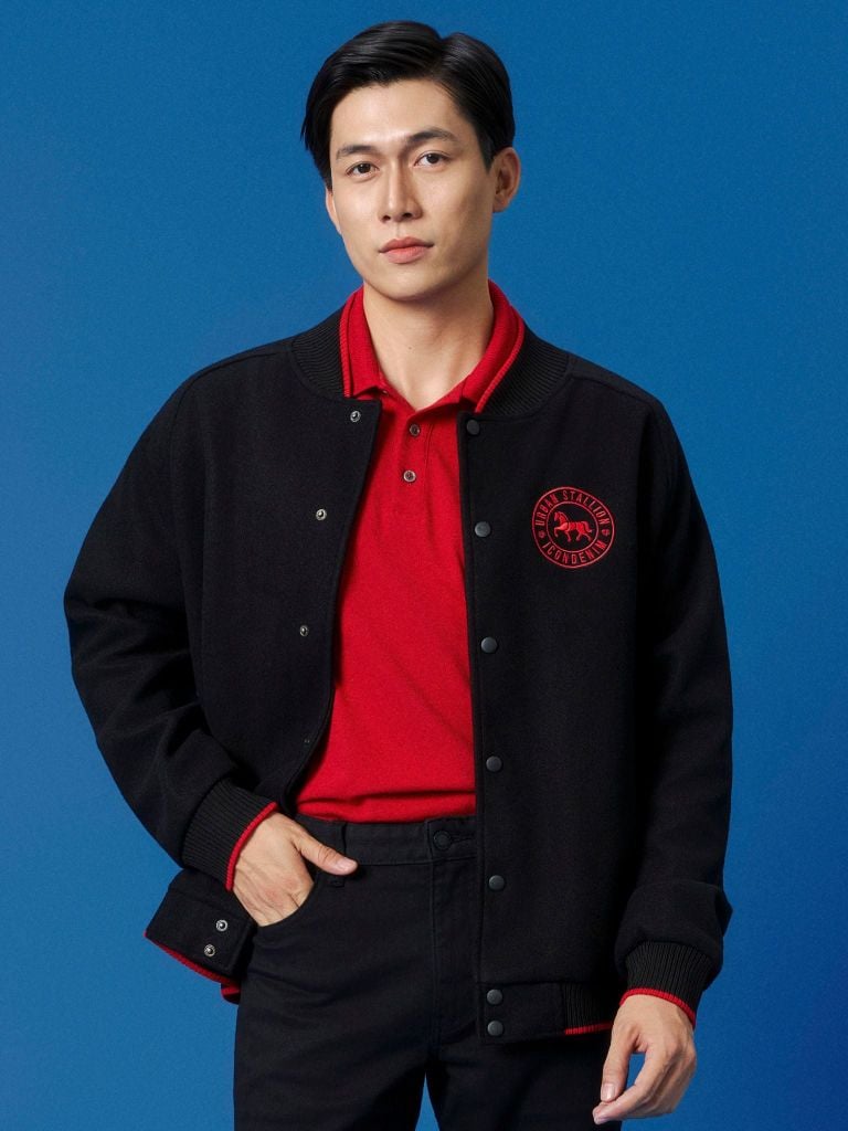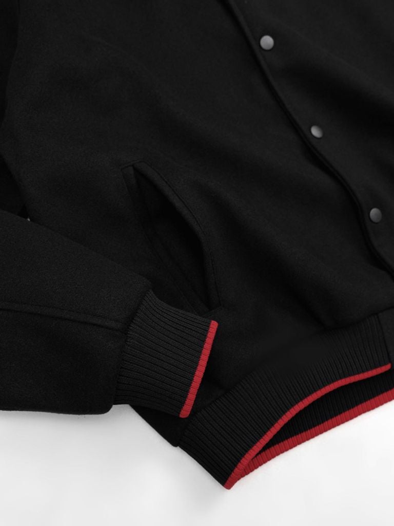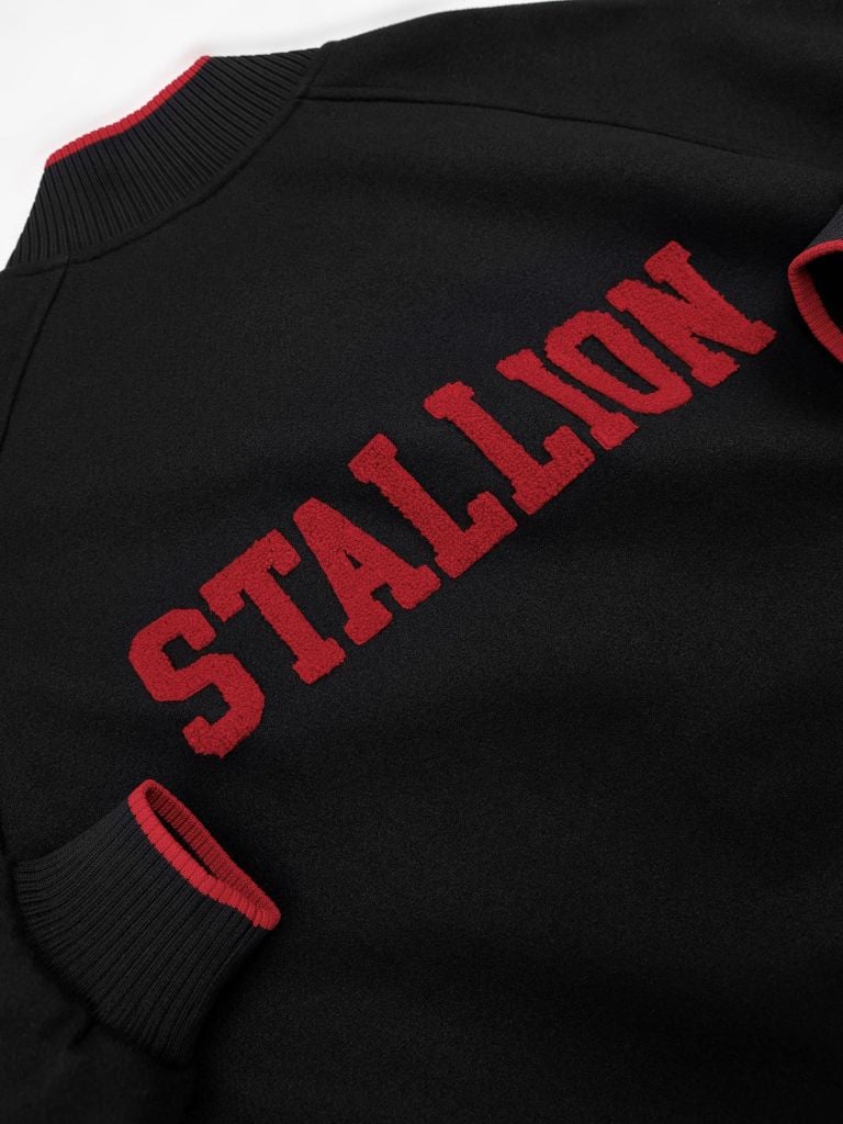 Thiết kế varsity cổ điển với tay Raglan tạo độ thoải mái khi cử động vai và tay. Thân sau sử dụng chi tiết thêu xù nổi bật, tạo điểm nhấn thị giác rõ ràng. Bo cổ, bo tay và lai áo dùng bo rib bản 5.5cm, phối sọc, nút bấm nhám đồng màu vải chính giúp tổng thể gọn gàng và đồng nhất.