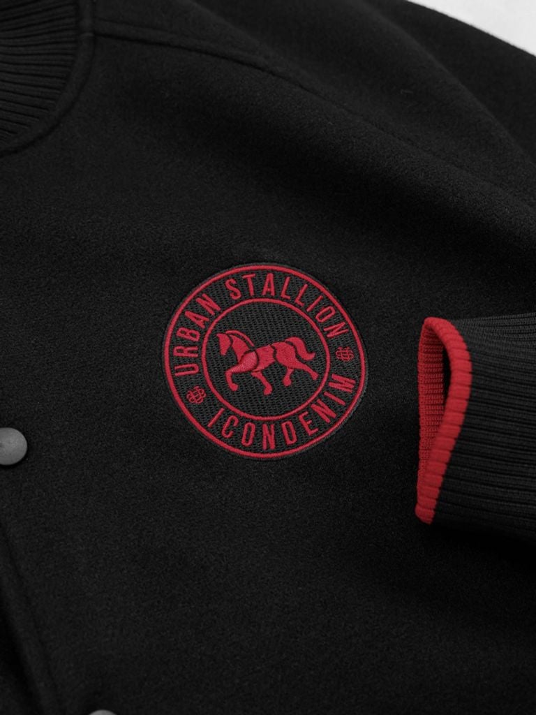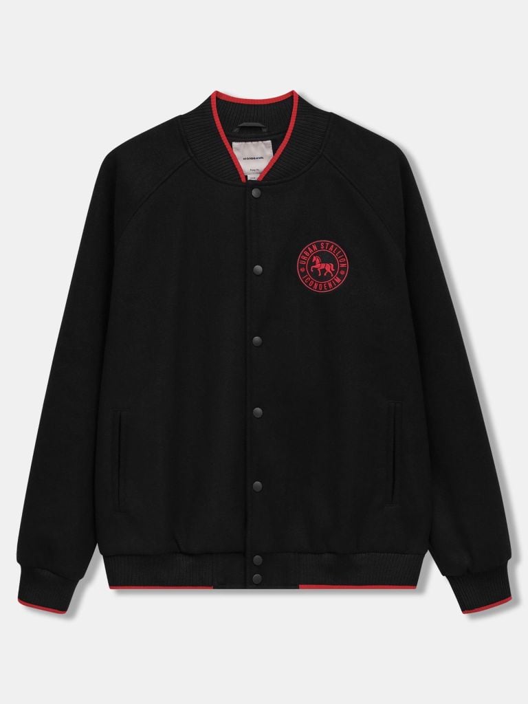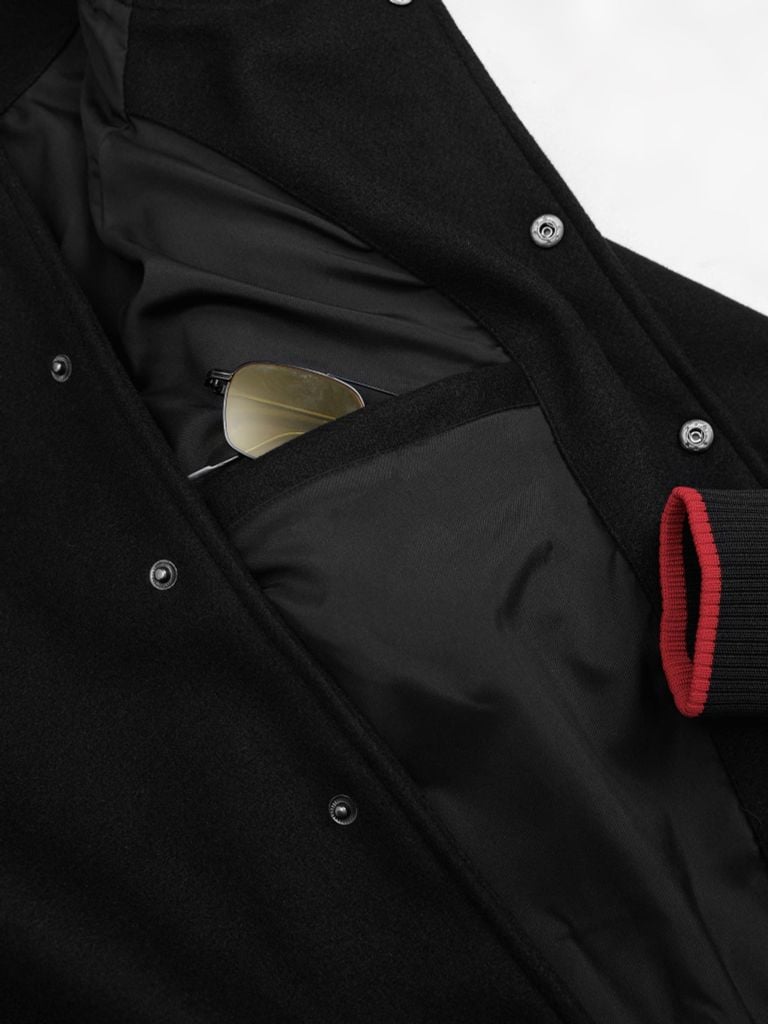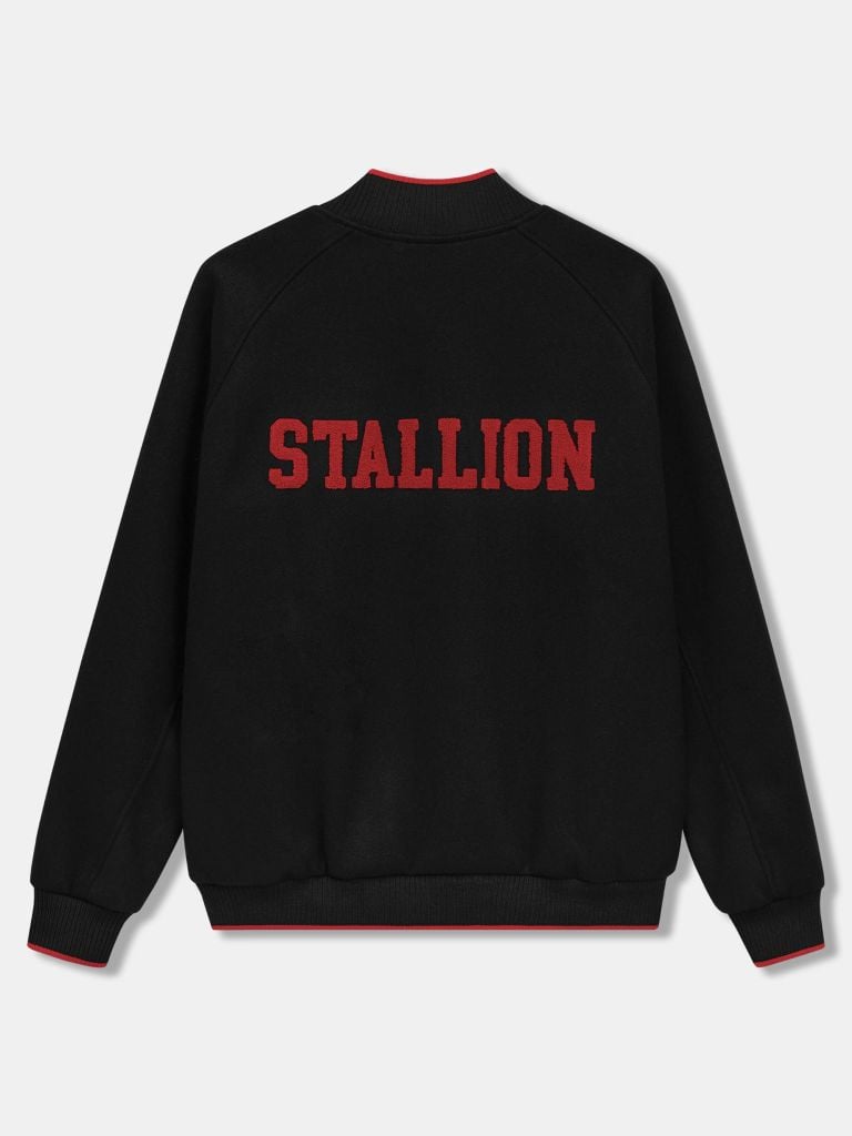 Thiết kế varsity cổ điển với tay Raglan tạo độ thoải mái khi cử động vai và tay. Thân sau sử dụng chi tiết thêu xù nổi bật, tạo điểm nhấn thị giác rõ ràng. Bo cổ, bo tay và lai áo dùng bo rib bản 5.5cm, phối sọc, nút bấm nhám đồng màu vải chính giúp tổng thể gọn gàng và đồng nhất.