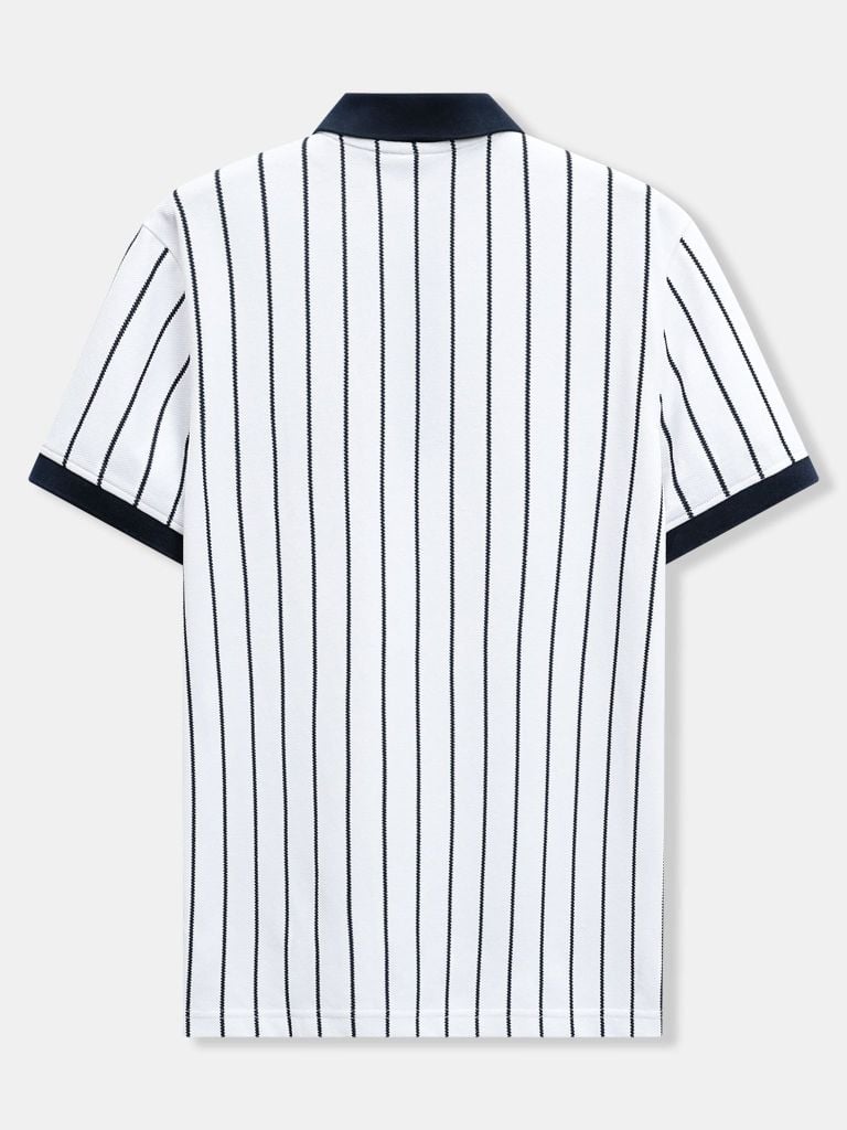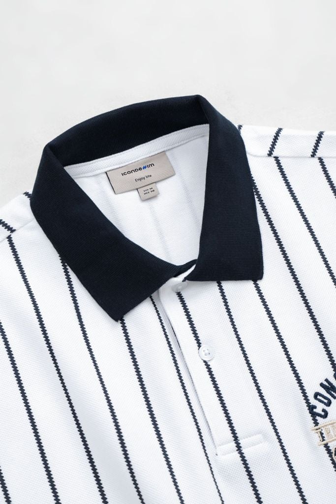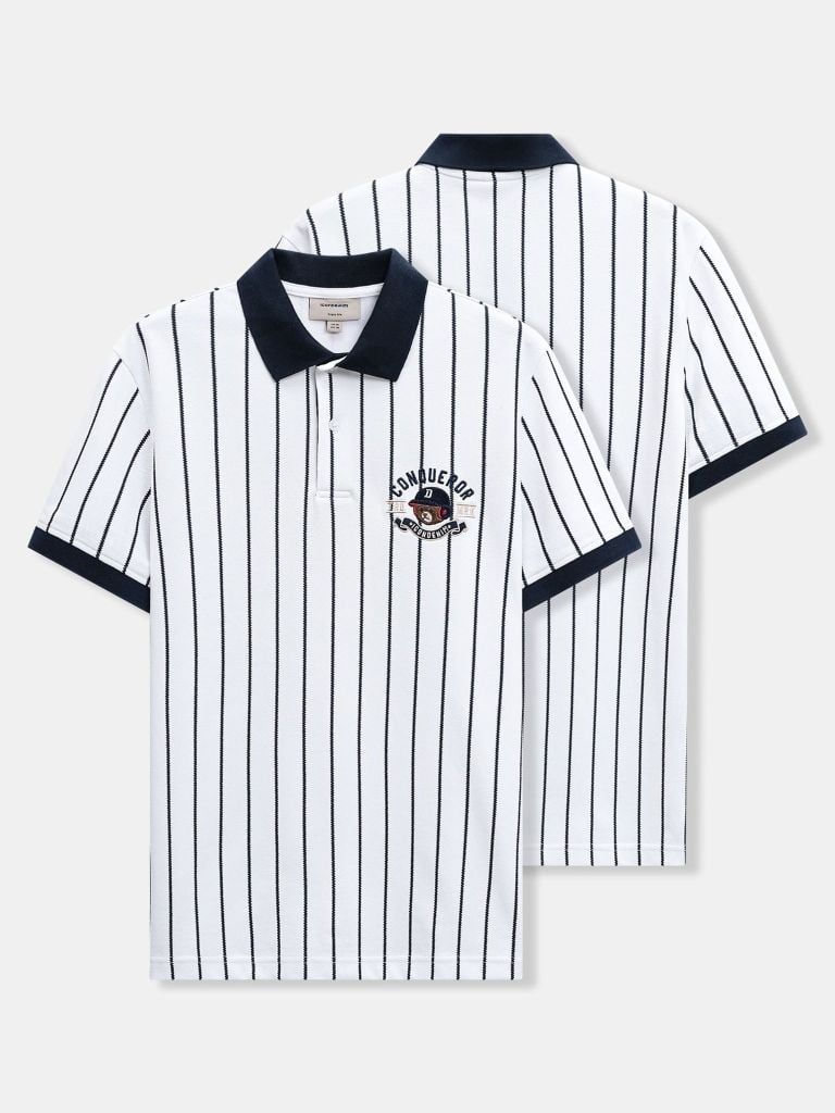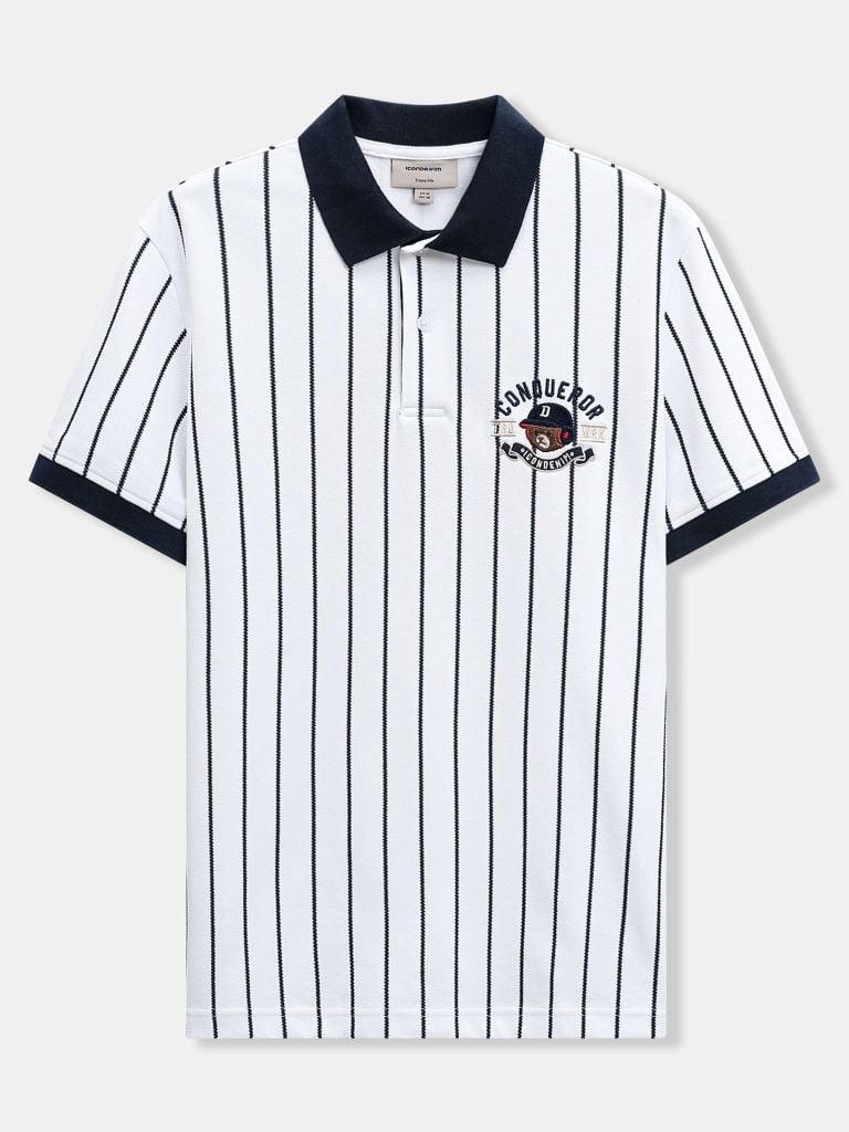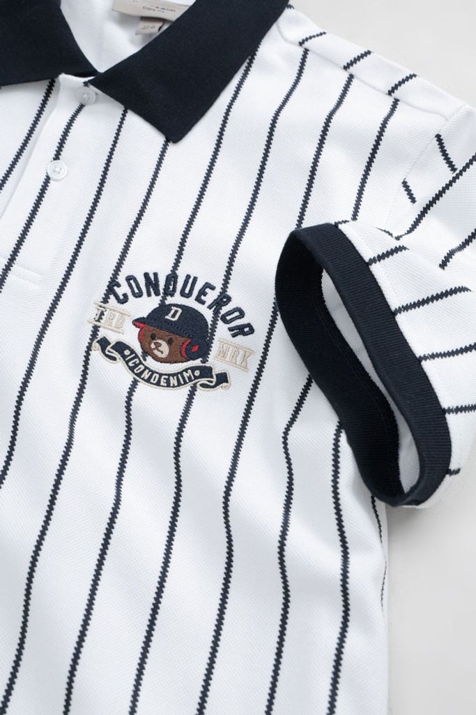 Cổ áo sử dụng bo dệt sọc dọc 6cm, tông navy đậm làm điểm nhấn nổi bật trên nền áo kem. Trụ áo 2 nút, phối màu navy tạo cảm giác thể thao. Hình gấu Conqueror Bear được thêu nổi mặt trước, tay áo và lai cổ bo dệt đồng bộ tone navy, giúp tổng thể liền mạch.