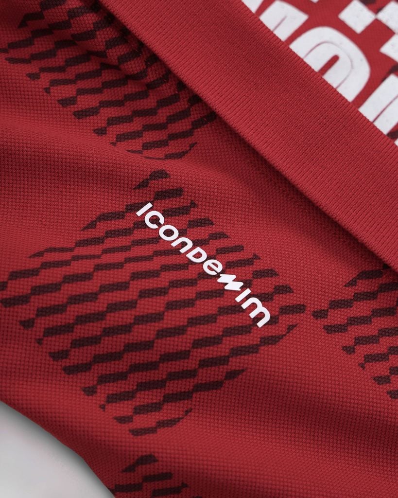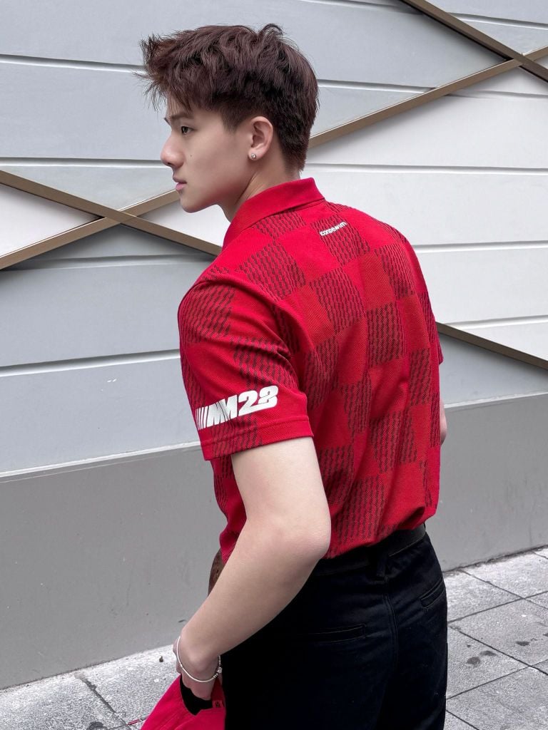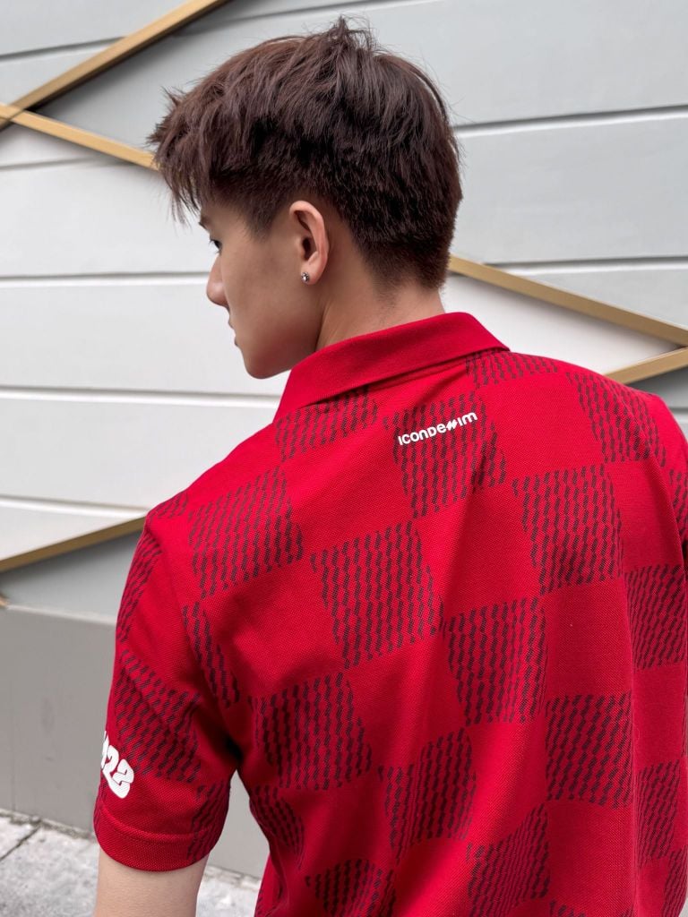 Thiết kế triển khai đa kỹ thuật gồm in dẻo, in trame hạt, thêu và pattern in thấm full thân áo. Cổ trụ sử dụng bo rib dệt mịn, trụ nẹp không nút tạo tổng thể gọn gàng, hiện đại.