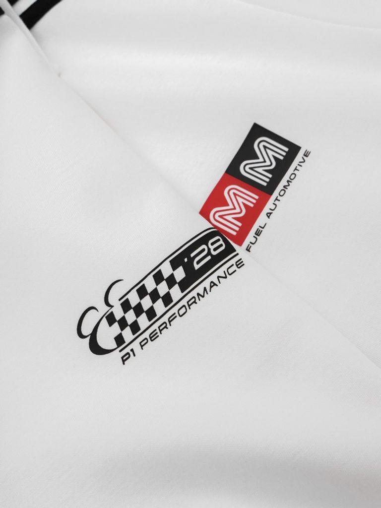 Thiết kế sử dụng kỹ thuật in cao thành kết hợp in dẻo, bố trí họa tiết trước – sau. Các chi tiết logo và graphic lấy cảm hứng từ tinh thần sporty – racing, tạo điểm nhấn nhận diện rõ ràng nhưng vẫn dễ ứng dụng. Bo cổ và bo tay sử dụng vải rib tiệp màu vải chính, đường may chắc chắn, mật độ mũi chỉ ổn định, đảm bảo độ bền và tính thẩm mỹ khi sử dụng lâu dài.