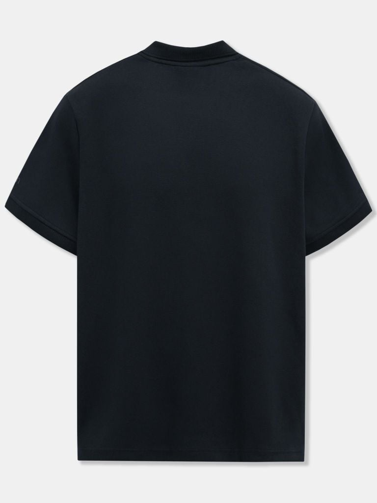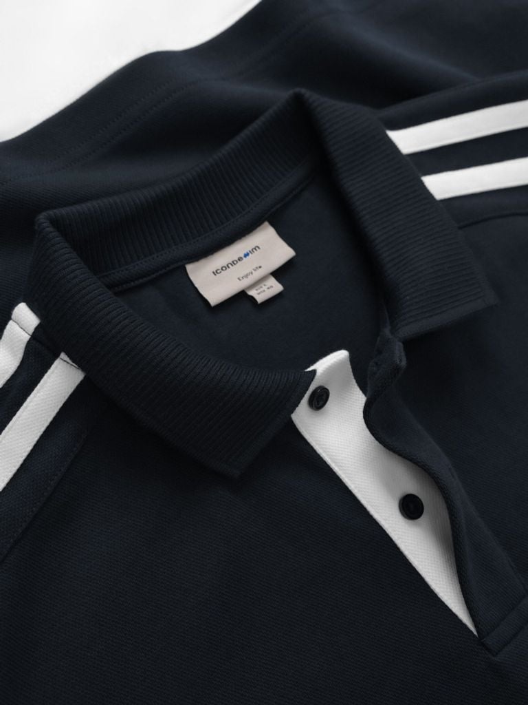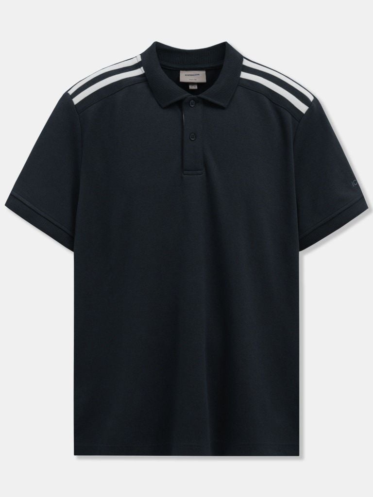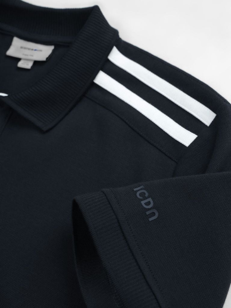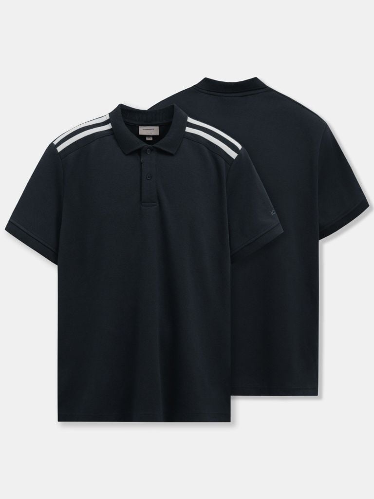 Form polo cổ bẻ 2 trụ, phối đường sọc line nổi bật ở vai, tạo điểm nhấn thể thao và hiện đại. Bo cổ và bo tay dệt đồng màu, ôm vừa vặn, đường may gọn gàng, chỉn chu. Phần trụ cổ dài 9.2 cm phối cùng nút cúc tông màu đồng bộ.