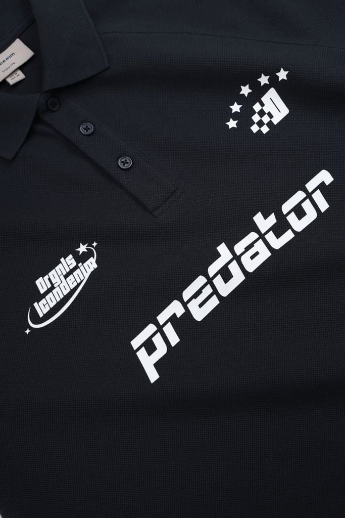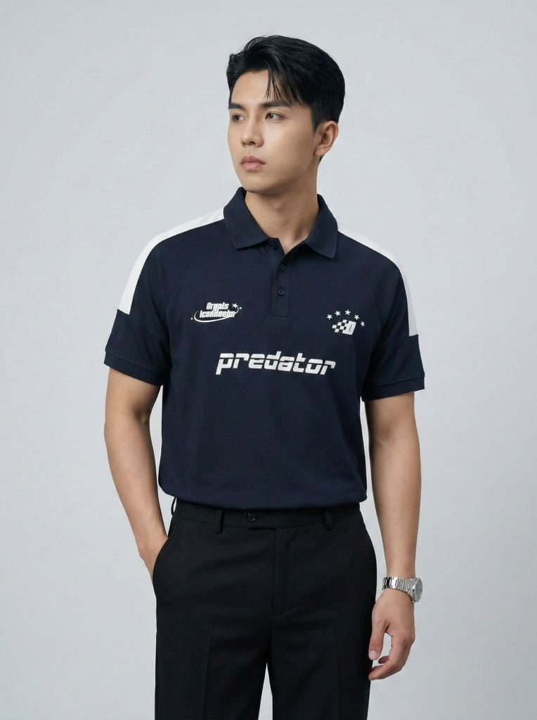 Bo cổ sử dụng vải Rib tiệp màu vải chính, bản 6cm, giữ cổ đứng và ổn định khi mặc. Trụ nẹp 3 nút sử dụng nút nhám đồng màu, tạo cảm giác liền mạch và tinh tế. Chi tiết in dẻo màu trắng kem ở thân trước được định vị đúng theo file thiết kế, bề mặt in sắc nét, gọn và bền màu.