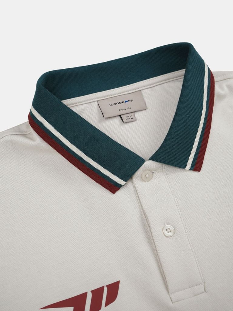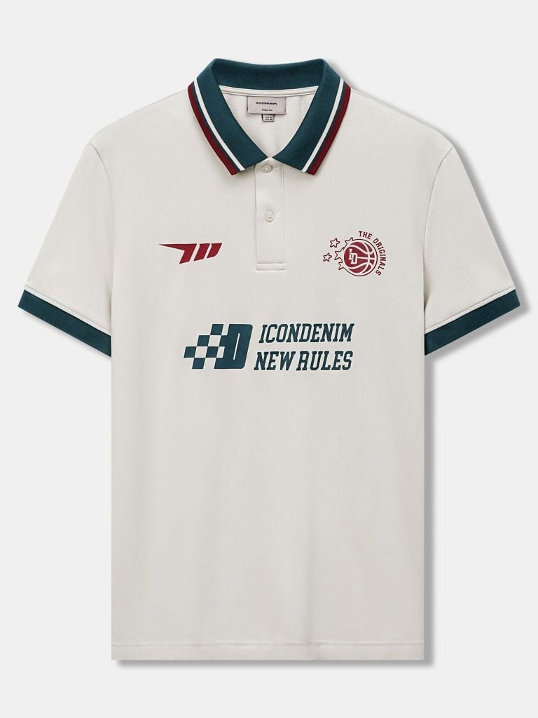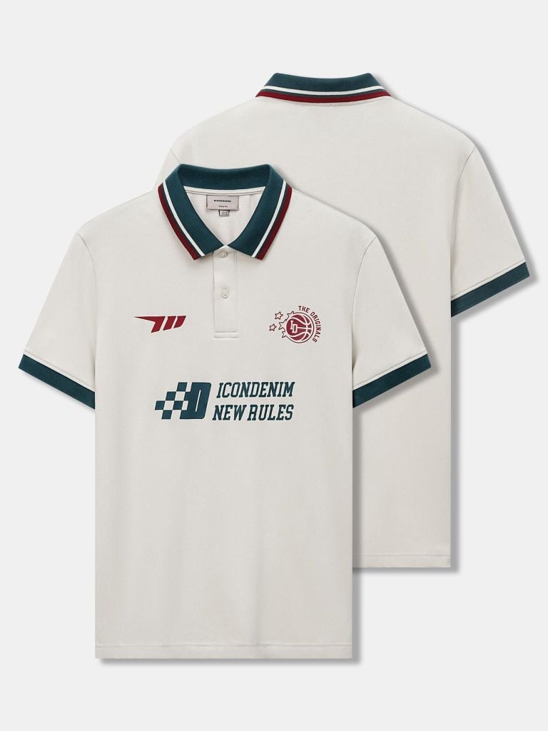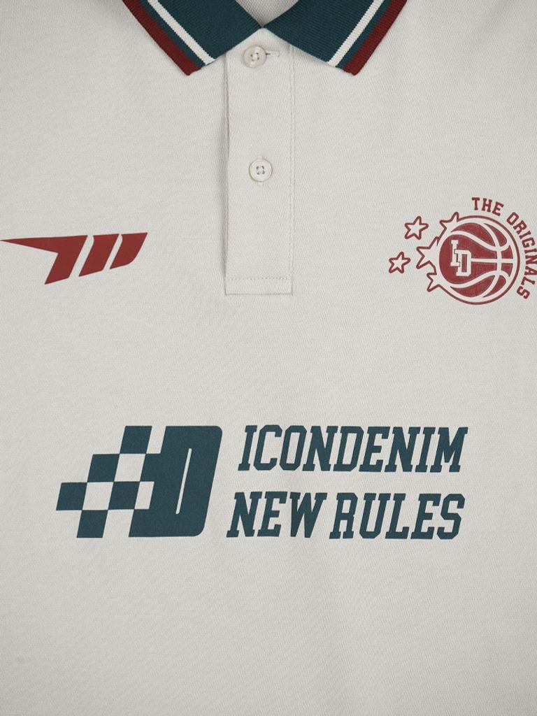 Bo cổ rib dệt sọc phối màu đồng bộ với chi tiết in, tạo điểm nhấn rõ nhưng vẫn gọn mắt. Trụ cổ 2 nút gài cùng màu vải chính. Thân trước kết hợp in dẻo và in cao thành, tay áo phối bo rib, kèm xẻ tà hai bên để tăng độ thoải mái khi mặc.