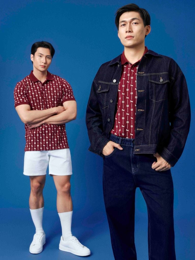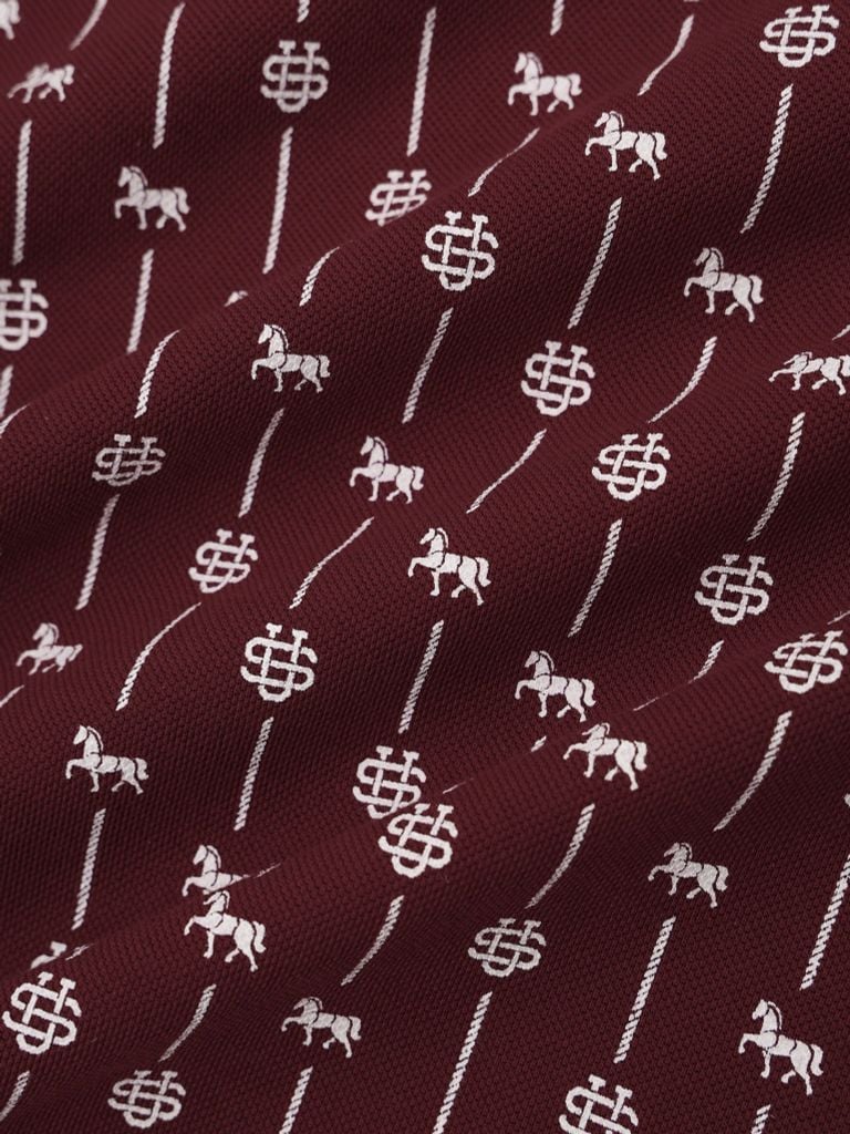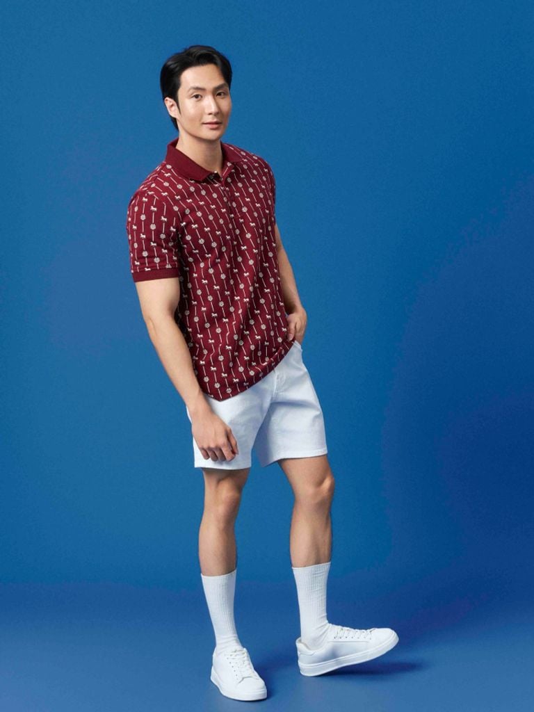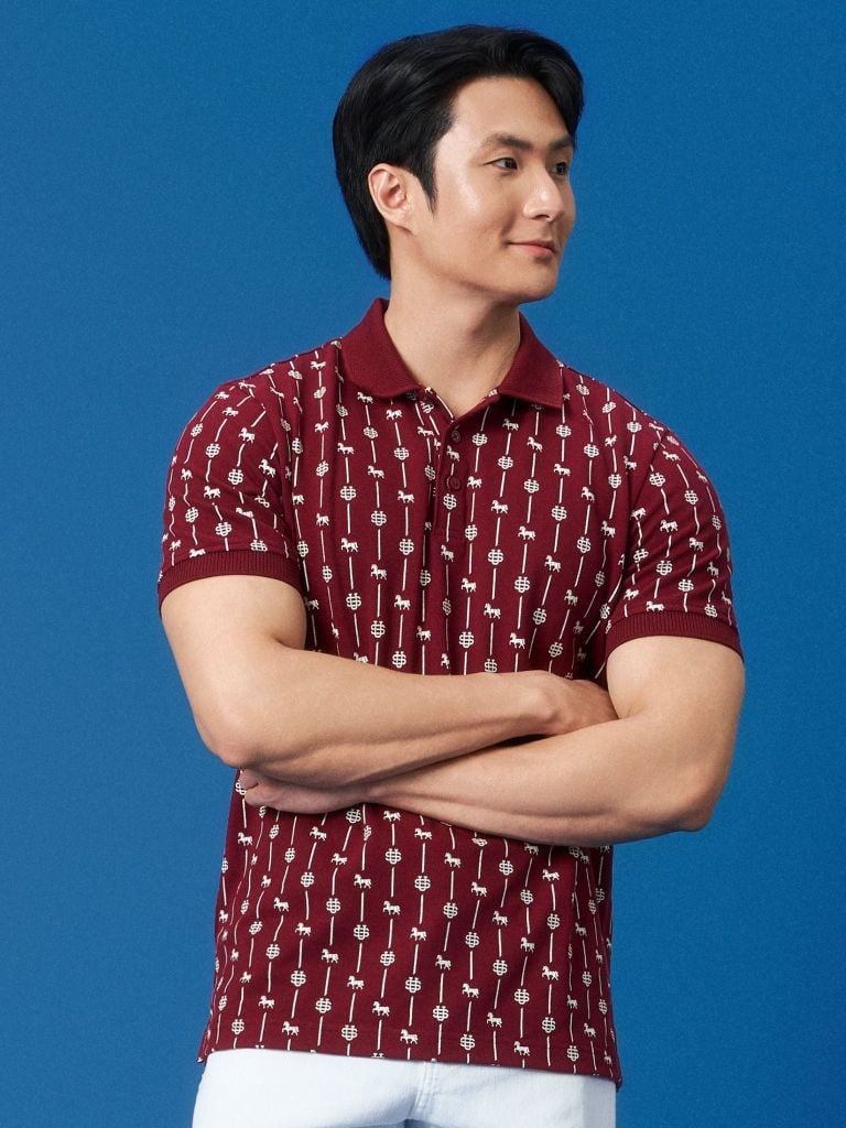 Áo sử dụng pattern in phủ toàn thân, họa tiết Regal Monogram, đảm bảo độ đồng đều giữa thân trước và thân sau. Bo cổ dùng vải Rib dệt sọc gân, trụ nẹp 3 nút gài sử dụng vải chính, tạo tổng thể liền mạch và chỉn chu.