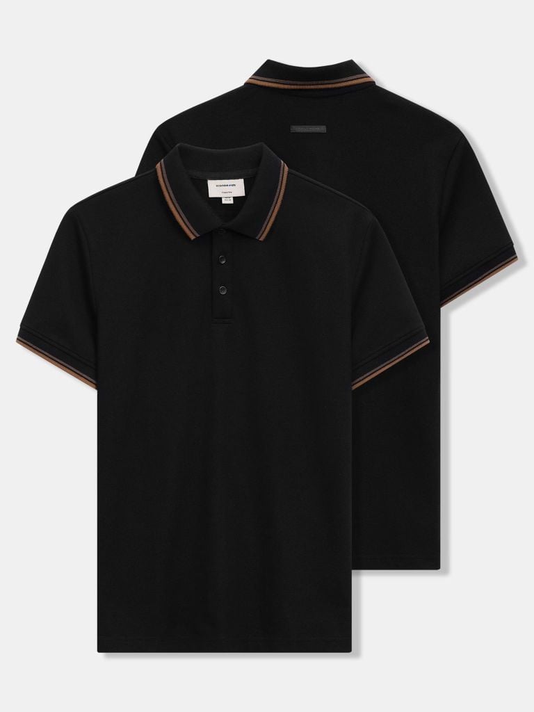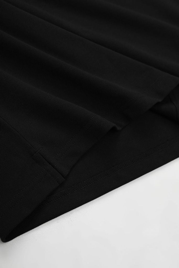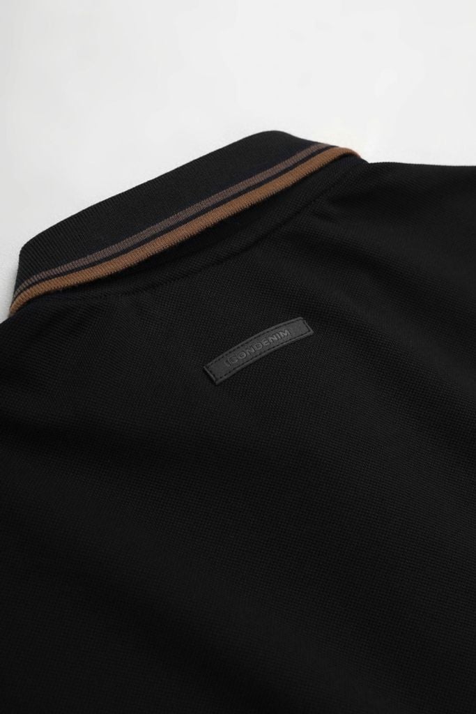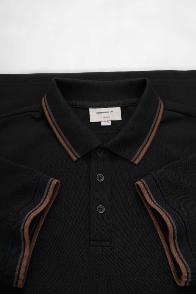 Thiết kế polo tối giản với chi tiết bo cổ và bo tay dệt sọc theo đúng tỉ lệ thiết kế, tạo điểm nhấn nhẹ nhưng rõ nét trên nền áo đen. Trụ áo 3 nút sử dụng vải chính, nút nhám đồng màu giúp tổng thể liền mạch và nam tính.