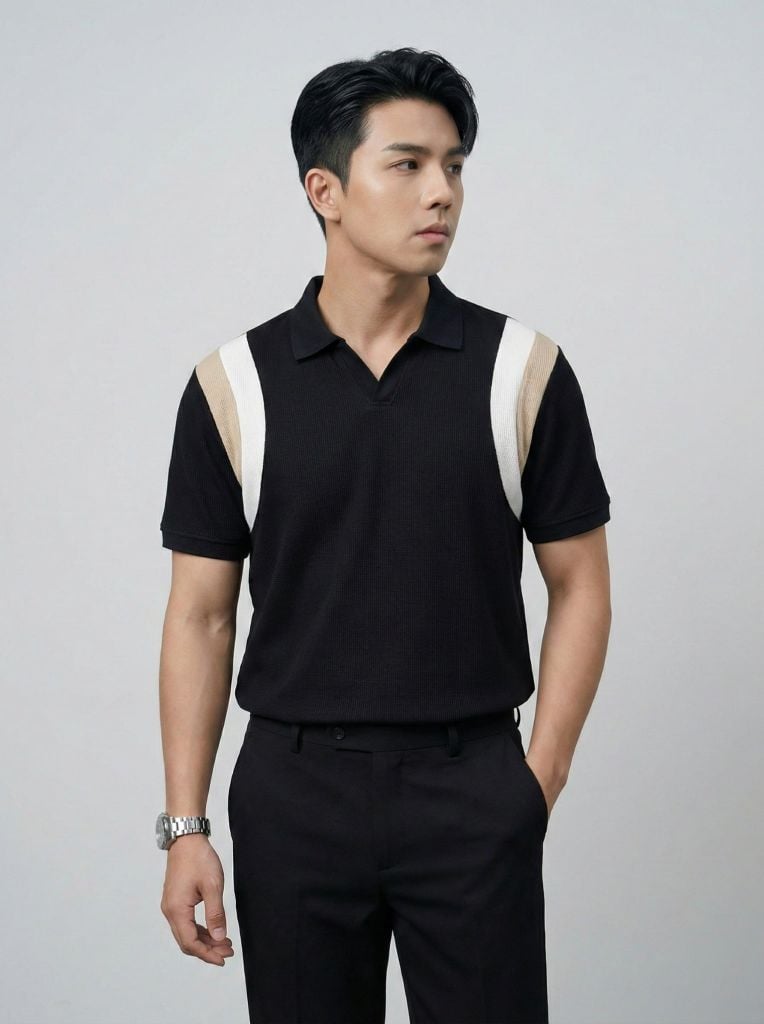 Bo tay dệt sọc mịn, dùng vải rib tiệp màu vải chính để đồng bộ tổng thể. Điểm nhấn nằm ở chi tiết rá phối vòng nách thân trước và thân sau, kết hợp thêu tiệp màu theo mảng phối, tạo cảm giác thể thao nhưng vẫn gọn gàng, dễ mặc.