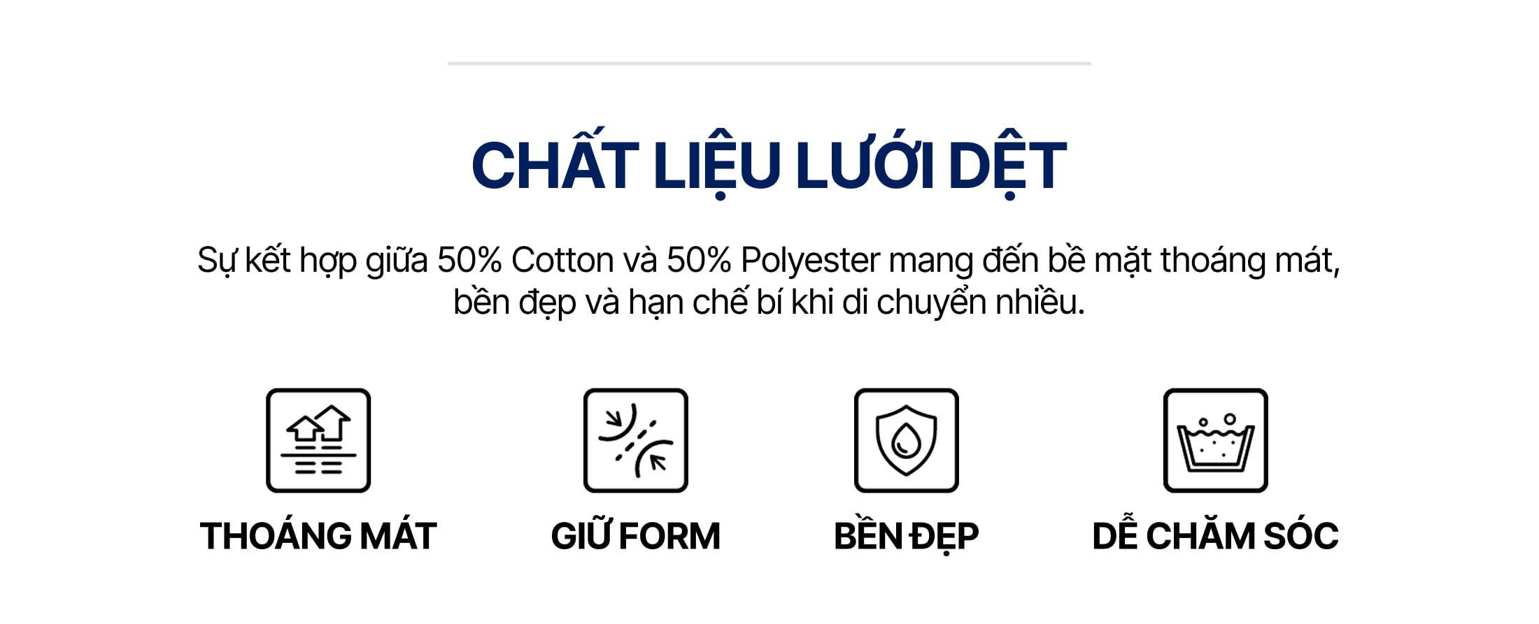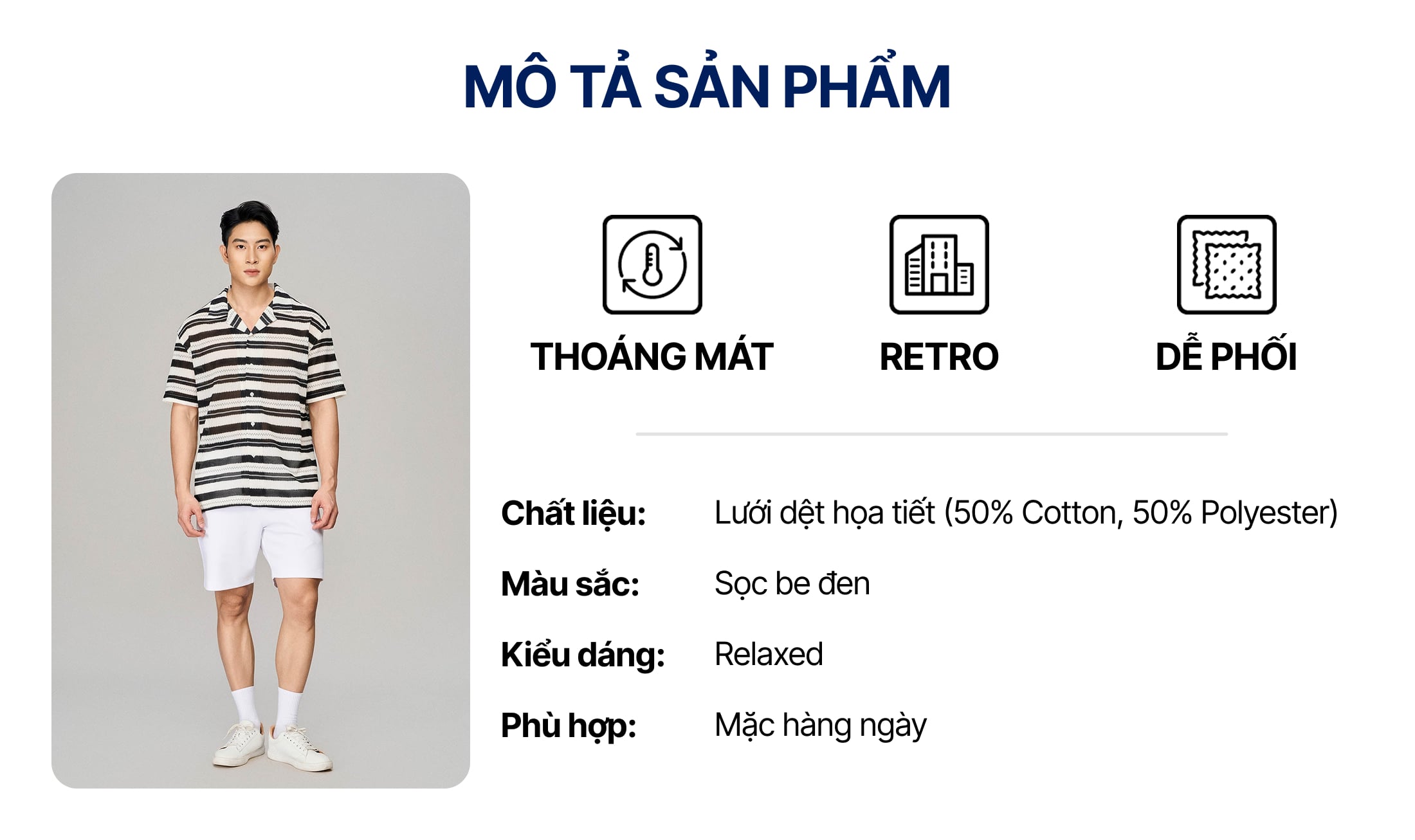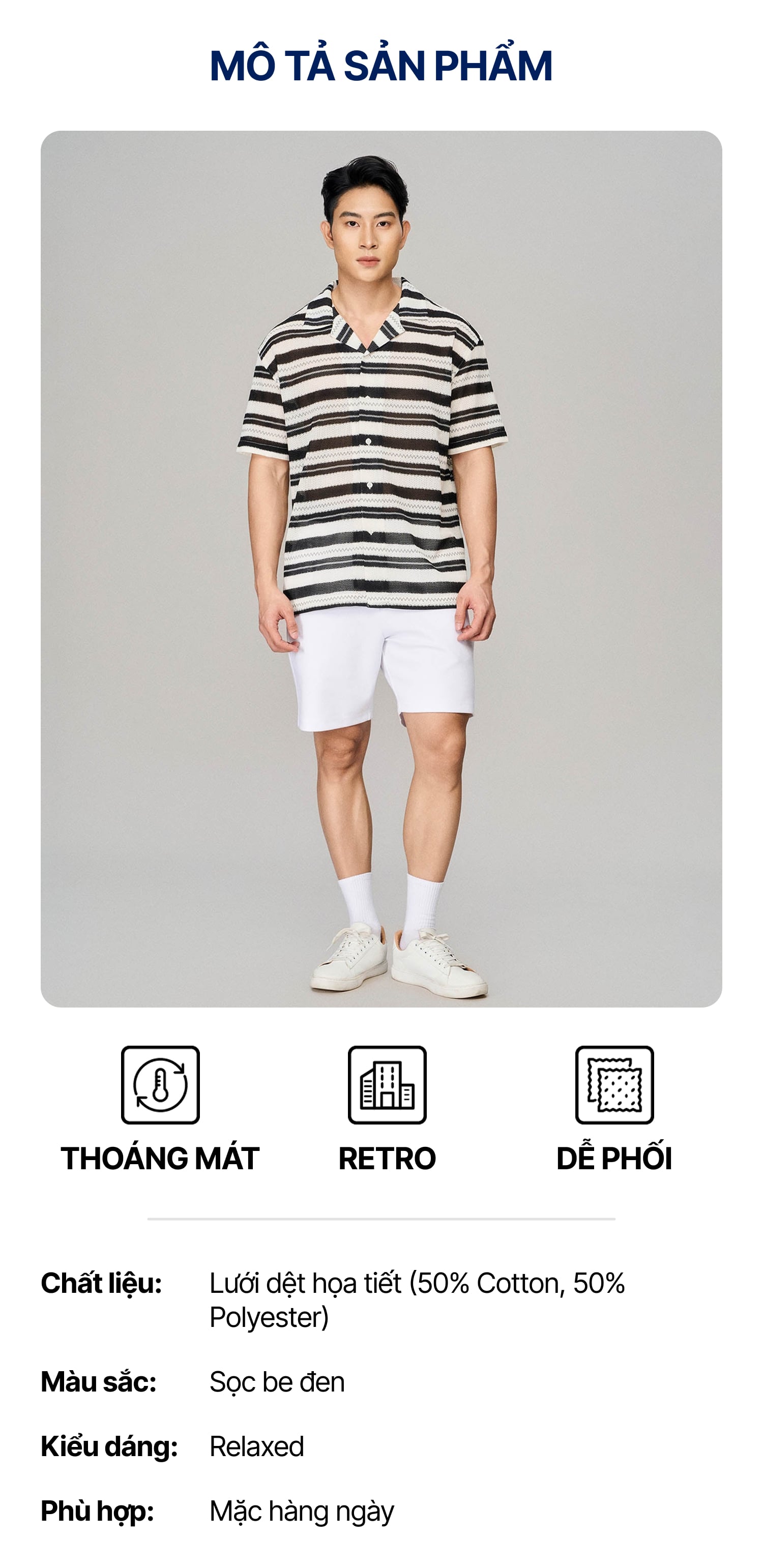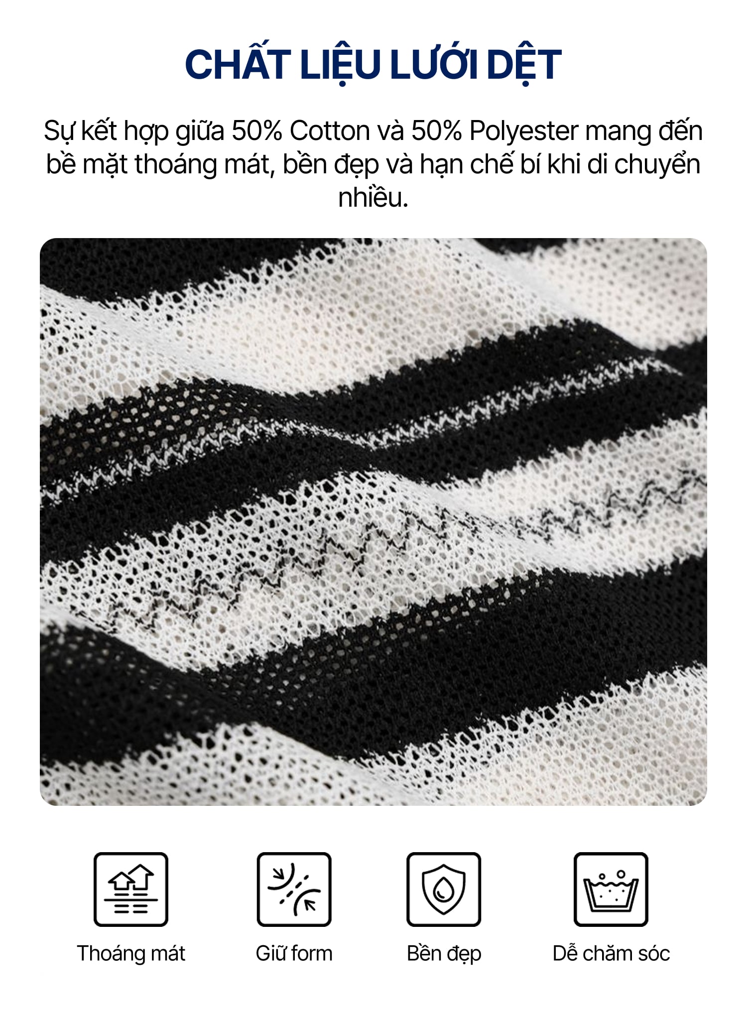 • Chất liệu: Lưới dệt họa tiết 50% Cotton, 50% Poly