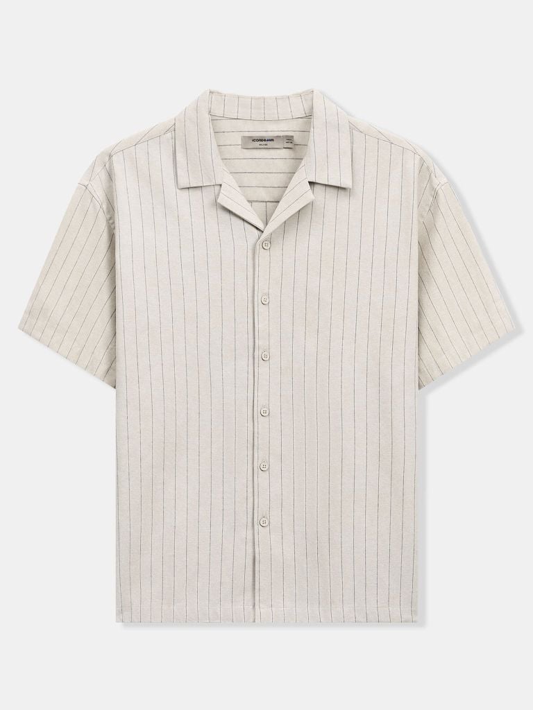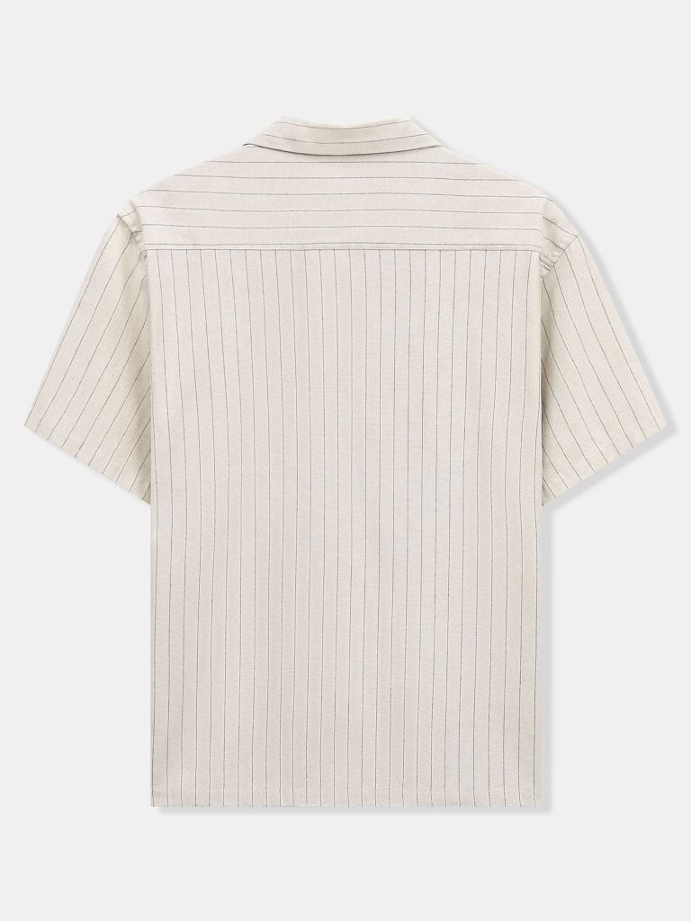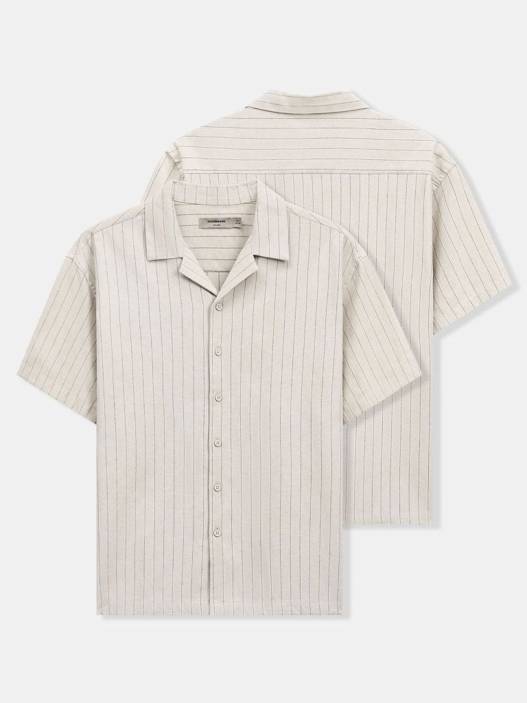 Họa tiết sọc dọc đều giúp tổng thể trông cao và gọn hơn khi mặc. Cổ Cuban mở nhẹ tạo cảm giác thoải mái, phóng khoáng, đúng tinh thần casual – nghỉ ngơi – du lịch. Hàng nút cùng màu vải chính, xử lý đồng bộ để tổng thể nhìn liền mạch, sạch sẽ.