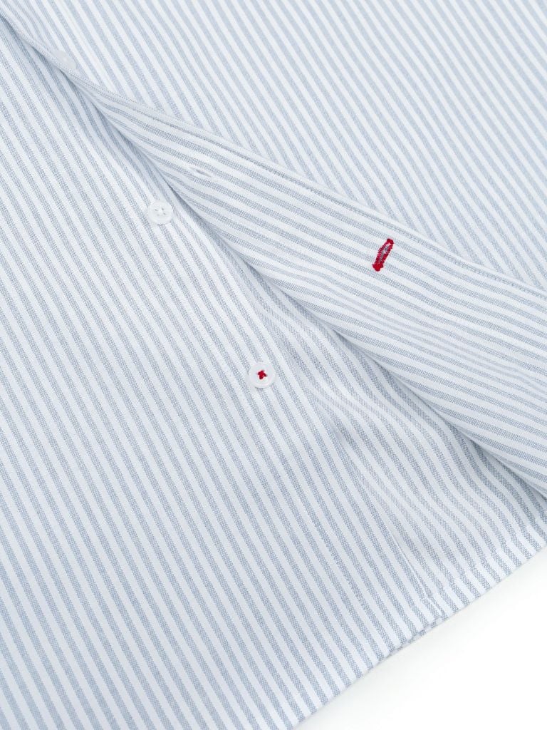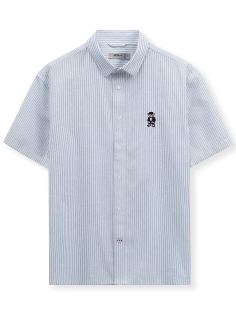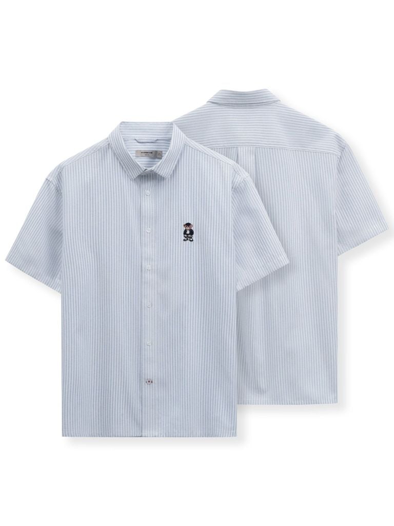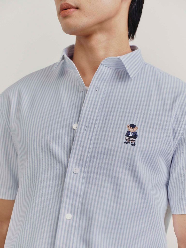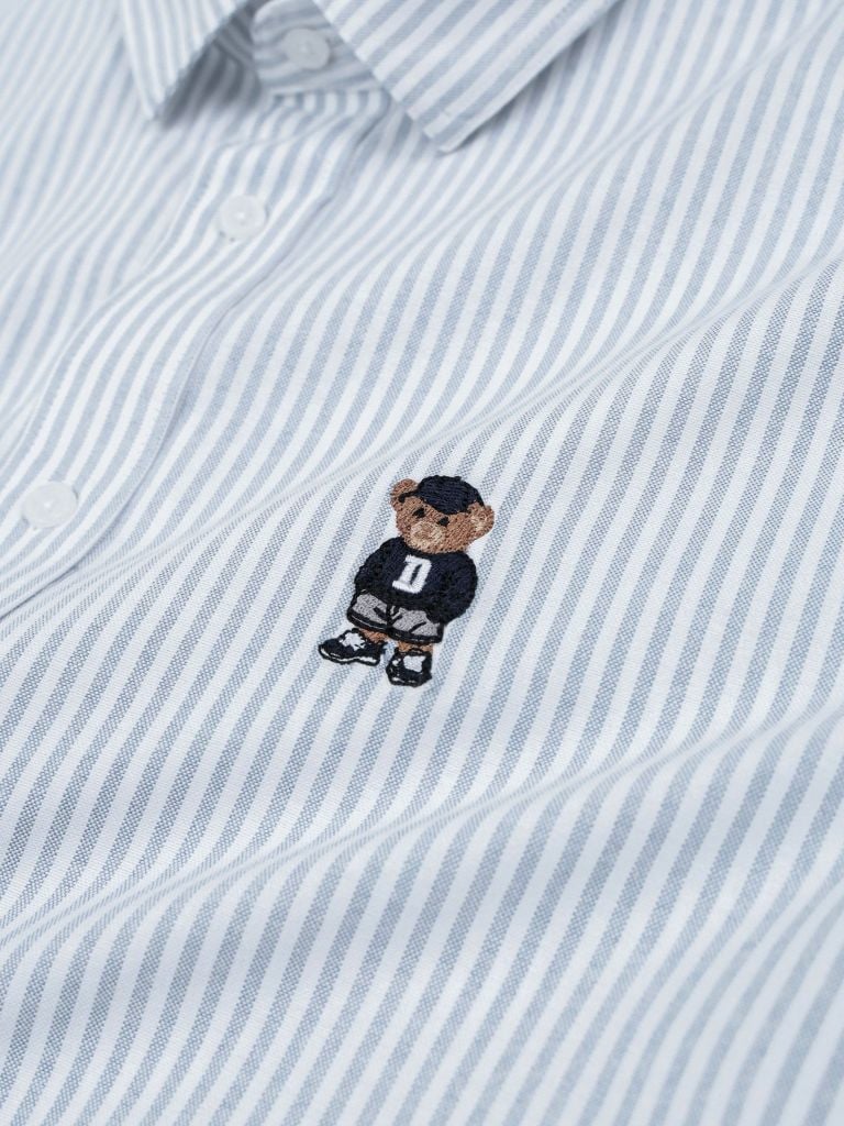 Họa tiết gấu thêu nổi bật trước ngực trái mang đến sự cool ngầu pha một chút tinh nghịch, thể hiện cá tính riêng của người mặc. Họa tiết sọc xanh kinh điển, gợi nhớ tinh thần Preppy và học đường thanh lịch.