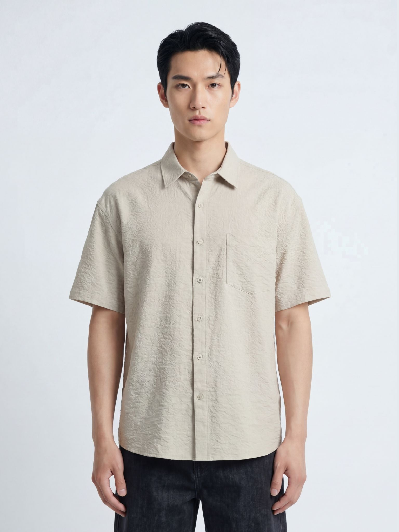 Vải sơ mi với thành phần 100% polyester, bề mặt đứng vải có độ rủ vừa phải, giúp áo giữ form ổn định nhưng vẫn thoải mái khi vận động.