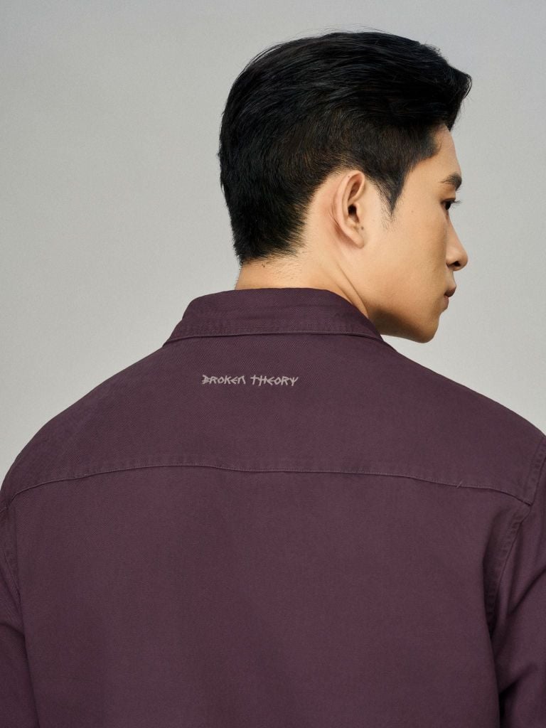 Áo sử dụng cổ đức may diễu 2 kim, đứng form và ôm gọn phần cổ. Nẹp áo được may rời, khuy cài và nút gài đồng bộ màu vải chính cho tổng thể tinh gọn. Phần ngực đặt cụm text thêu theo đúng tỷ lệ thiết kế, vị trí được căn chỉnh riêng theo từng size để bố cục cân đối.