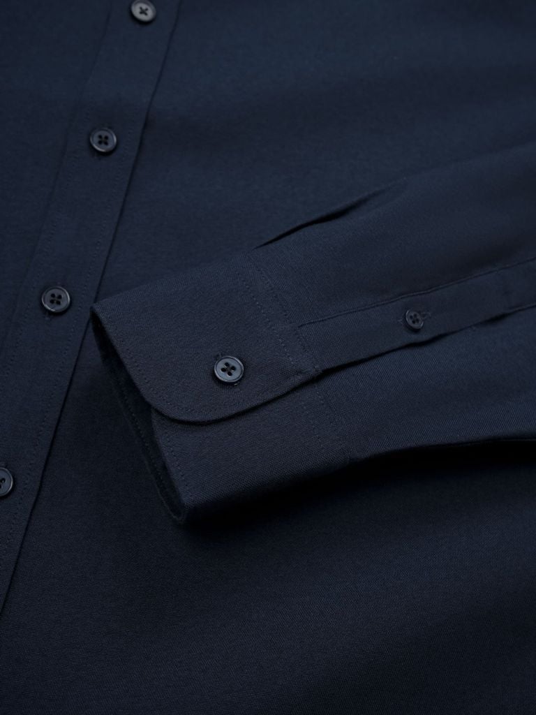 Vải Oxford trơn có bề mặt dệt mịn, cho cảm giác mặc thoáng và dễ chịu. Tỷ lệ cotton giúp áo mềm tay và hút ẩm tốt hơn, trong khi polyester hỗ trợ giữ phom ổn định giúp tổng thể gọn gàng.