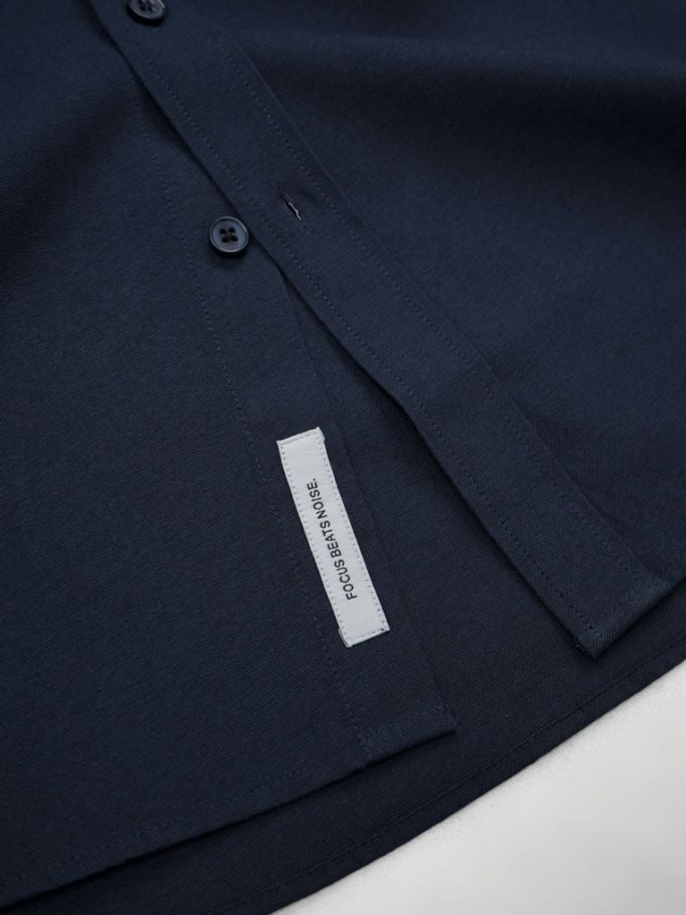Thiết kế cổ đức gọn gàng, nẹp áo đáp diễu chỉ rõ nét giúp mặt trước nhìn chỉn chu hơn. Lai áo hơi vạt bầu và manchette góc tròn 1 nút gài, tạo tổng thể lịch sự. Điểm nhấn quote nhỏ đặt trên nẹp nút mang lại cảm giác tinh tế, đủ khác biệt mà không làm chiếc áo mất đi vẻ tối giản.