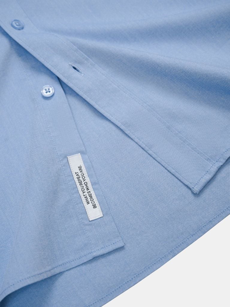 Thiết kế cổ đức chỉn chu, đi cùng nẹp áo đáp rõ nét giúp mặt trước nhìn sạch hơn. Lai áo được thiết kế hơi vạt bầu, kết hợp detail dây treo tăng thêm điểm nhấn hoàn thiện. Chi tiết quote nhỏ đặt ở nẹp nút là điểm nhận diện tinh tế, vừa đủ để chiếc áo có cá tính riêng.