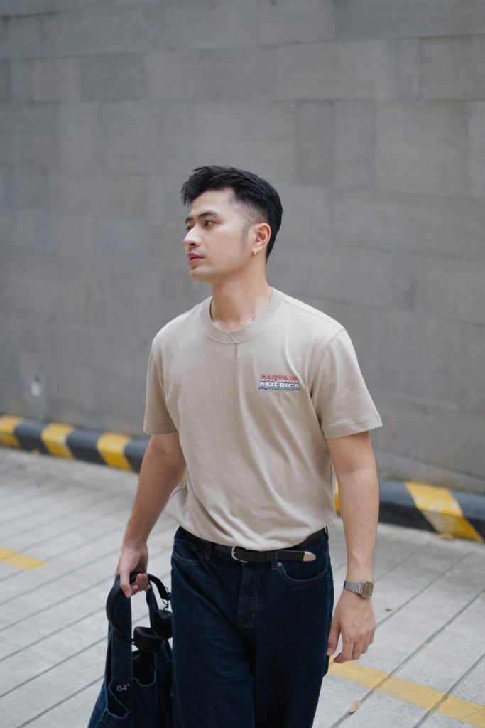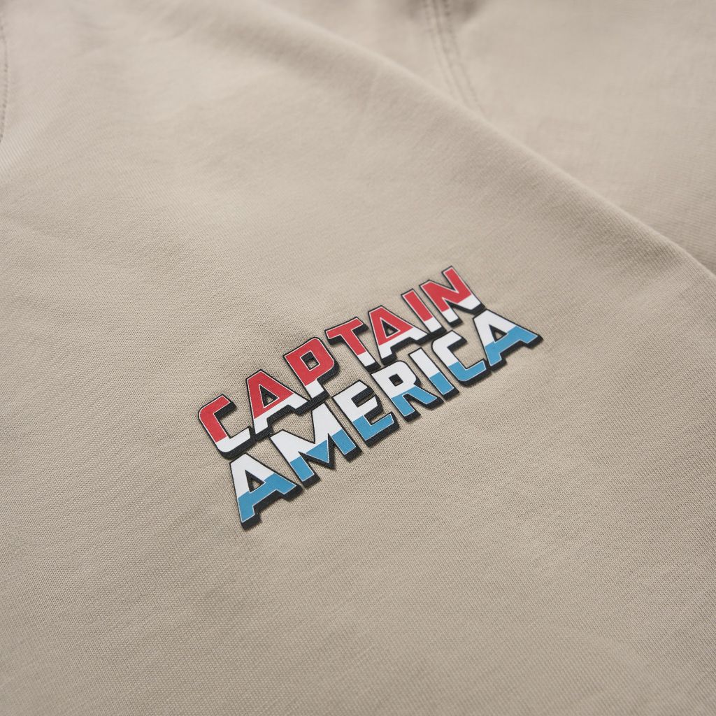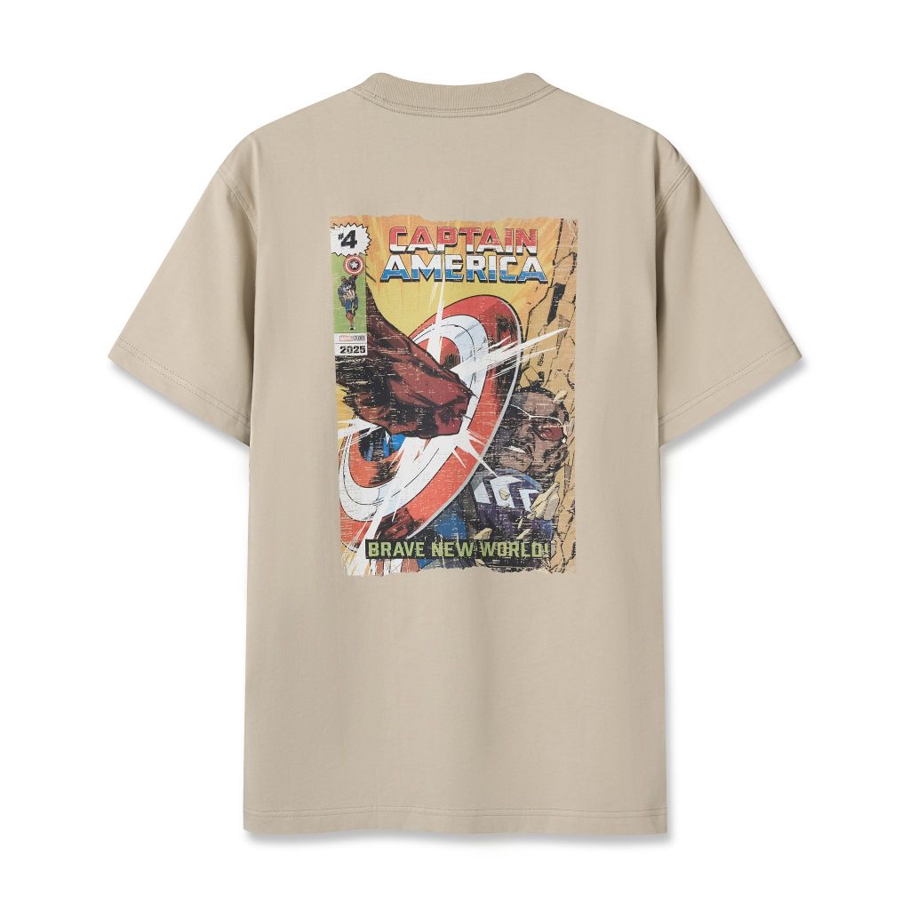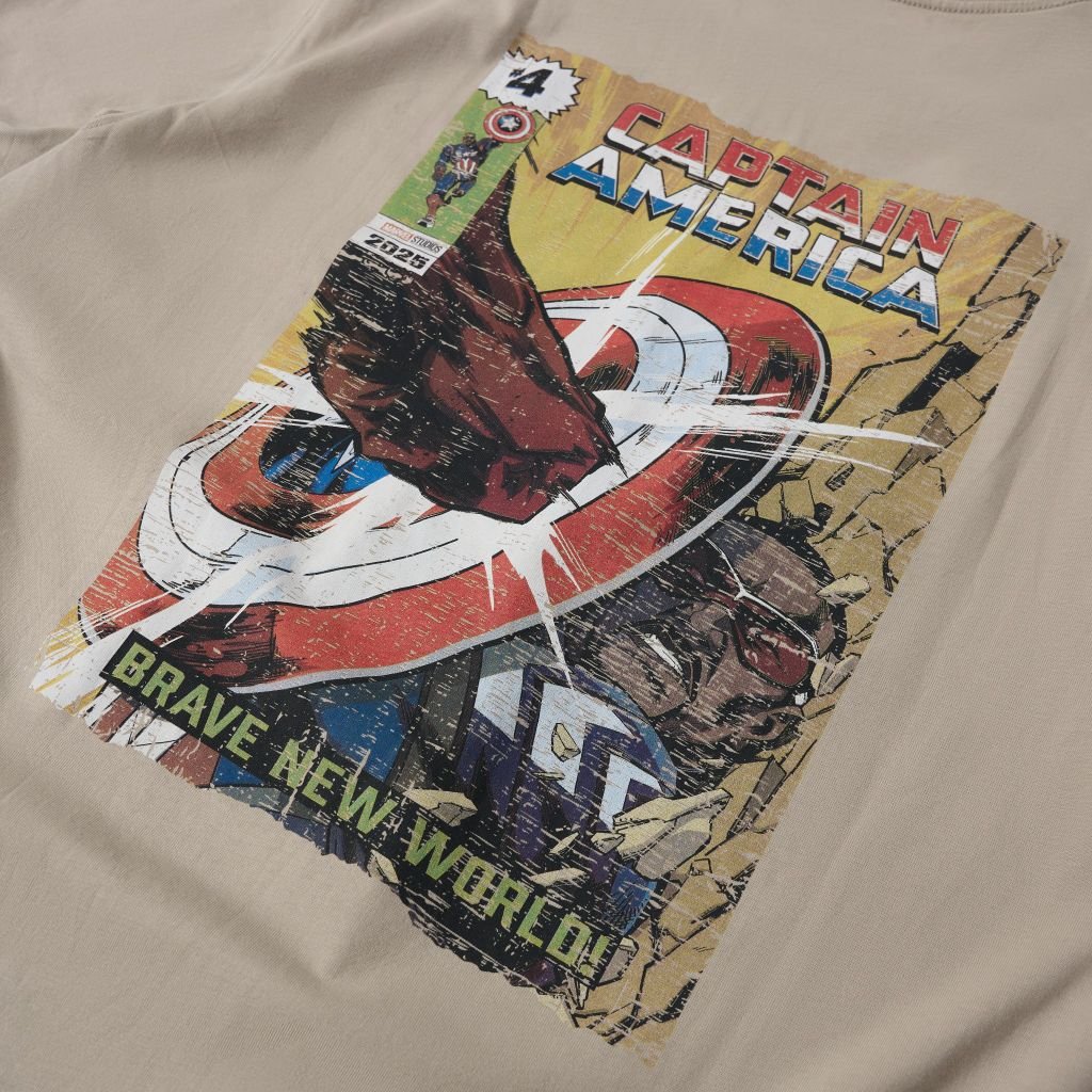 Nét vẽ Captain America trong bộ phim Brave New World hiện lên đầy ấn tượng, dũng mãnh chống đỡ trước kẻ thù hùng mạnh, toát lên khí chất của một đội trưởng của công lý khắc họa ở hình in charm trên thân áo.
