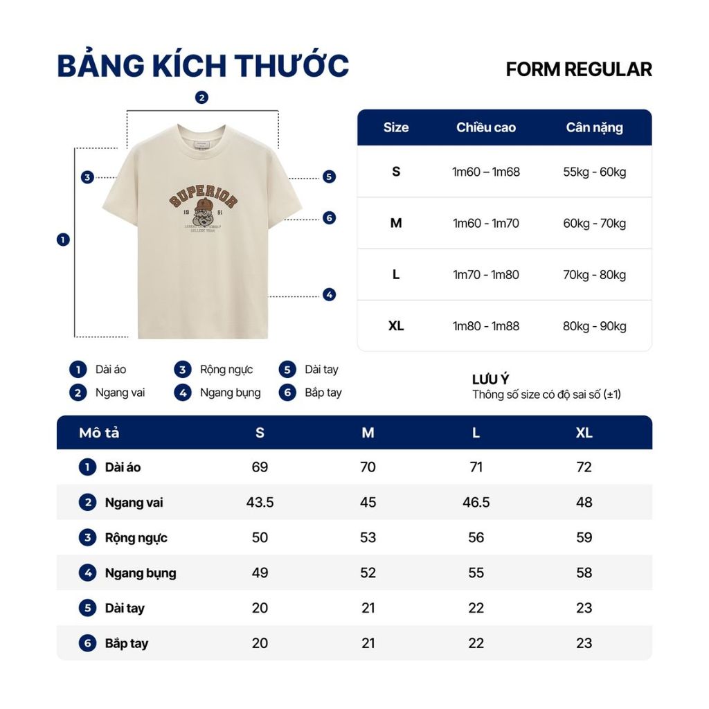 Form regular phù hợp đa số vóc dáng, giữ tỷ lệ vai – tay – thân vừa vặn, dễ chịu trong các hoạt động hàng ngày. Lai áo may 2 kim chắc chắn, giúp áo đứng phom và sạch sẽ khi mặc. Dễ phối cùng jeans, short hoặc jogger theo phong cách hiện đại, trẻ trung.