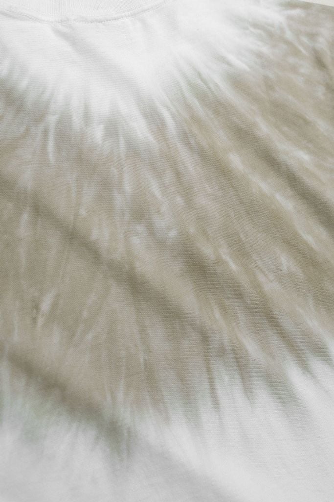 Áo được xử lý wash tie-dye trên nền trắng, tạo hiệu ứng loang màu tự nhiên và khác biệt trên từng sản phẩm. Chi tiết in kết hợp in cao cùng màu nền nhám giúp tổng thể hài hòa, không quá nổi nhưng vẫn có điểm nhấn thị giác. Mỗi chiếc áo mang sắc độ riêng, tăng cảm giác thủ công và cá tính.