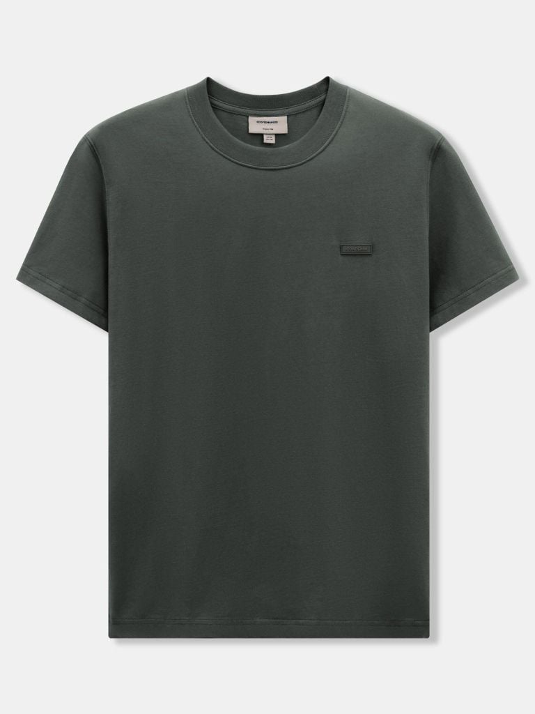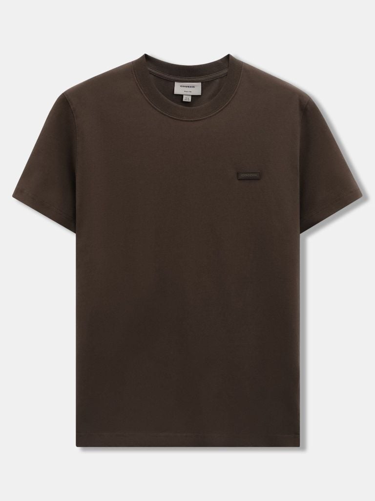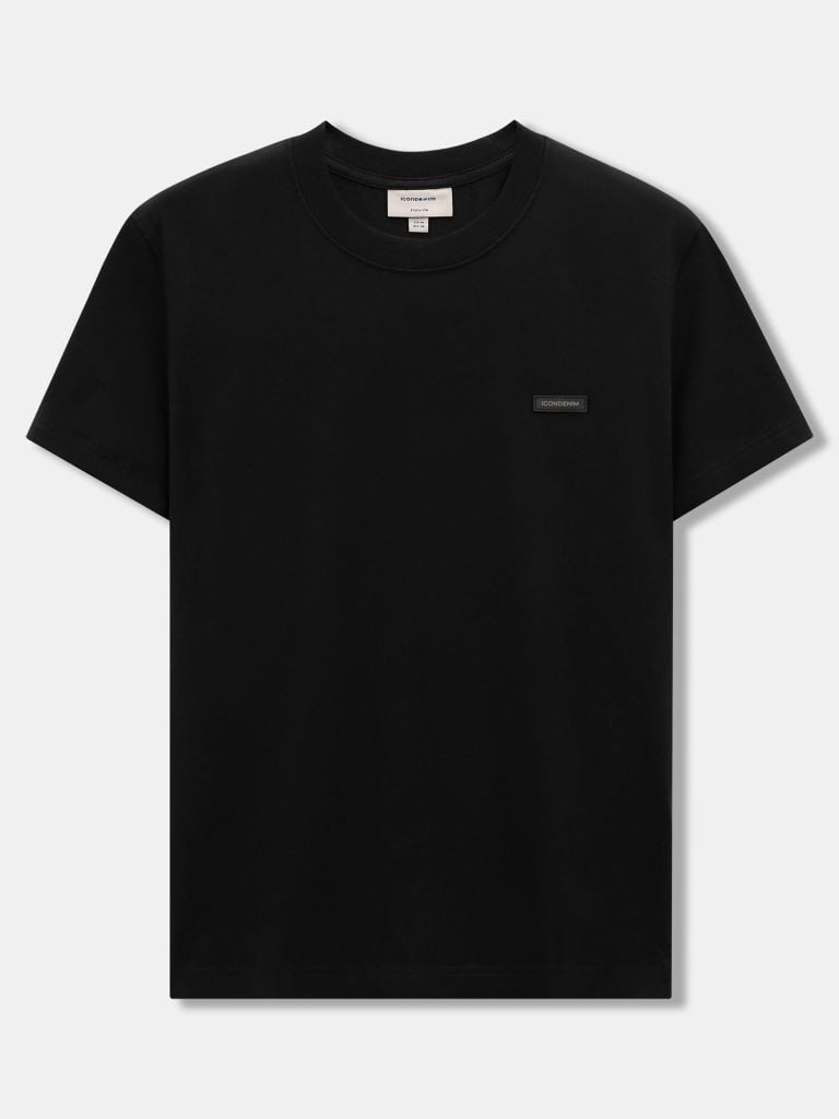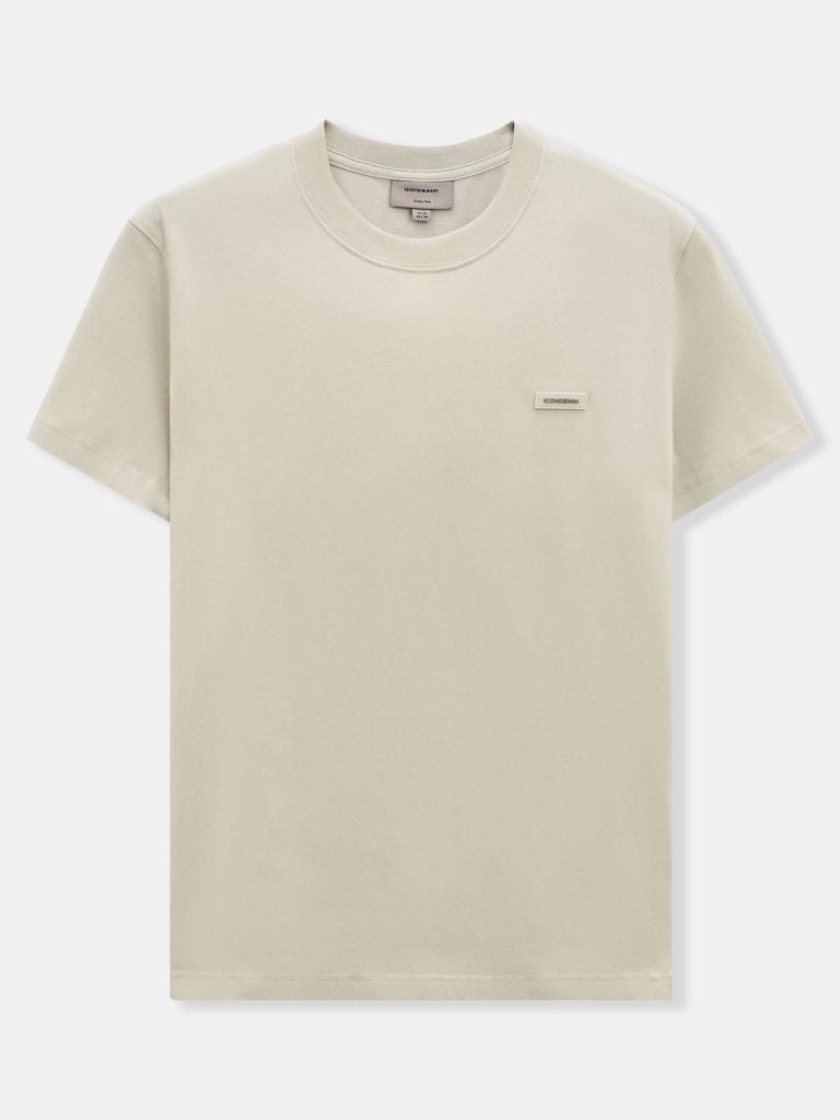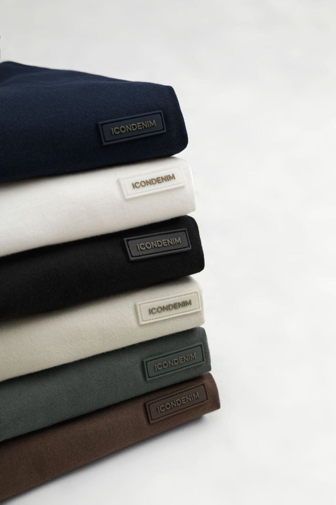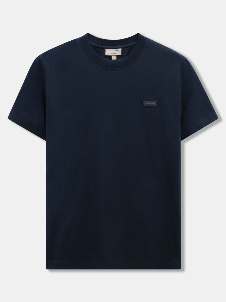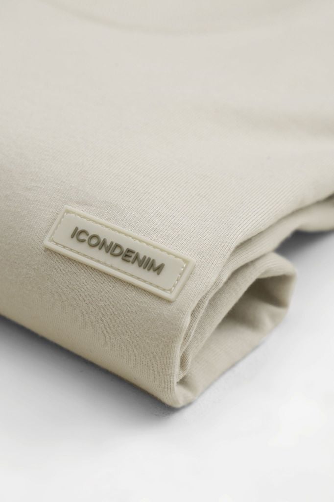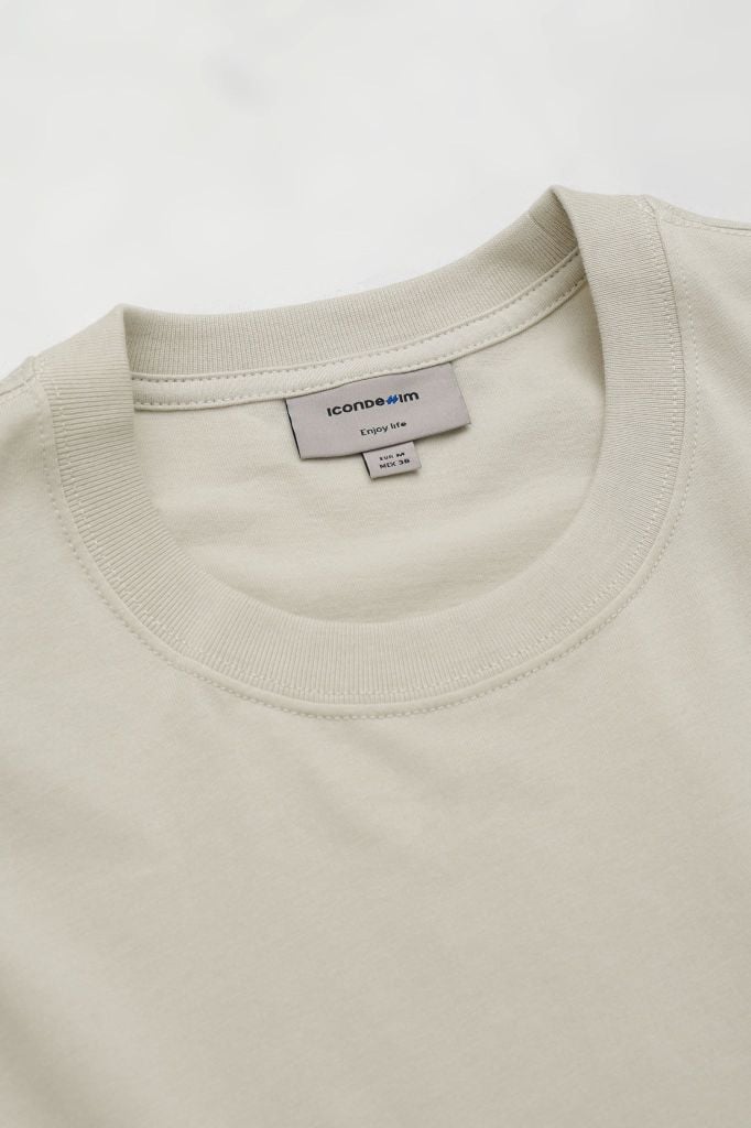 Tổng thể áo đi theo tinh thần basic: cổ tròn hoàn thiện bằng bo dệt rib đồng màu giúp cổ giữ dáng. Thân trước đặt detail cao su ICONDENIM kích thước nhỏ gọn, tạo điểm nhấn nhận diện nhưng không làm rối bề mặt áo.