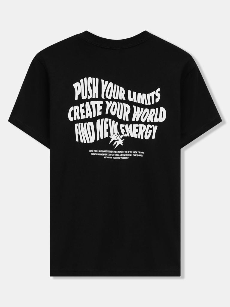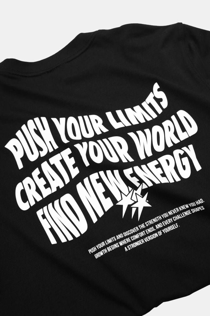 Điểm nhấn nằm ở chi tiết in xốp nổi mặt trước tối giản, mặt sau nổi bật thông điệp. Bề mặt in lên màu đều, viền chữ rõ, tạo hiệu ứng nổi tinh tế nhưng không làm “nặng” nền vải. Tổng thể giữ tinh thần graphic hiện đại, dễ phối mà vẫn có nhận diện.