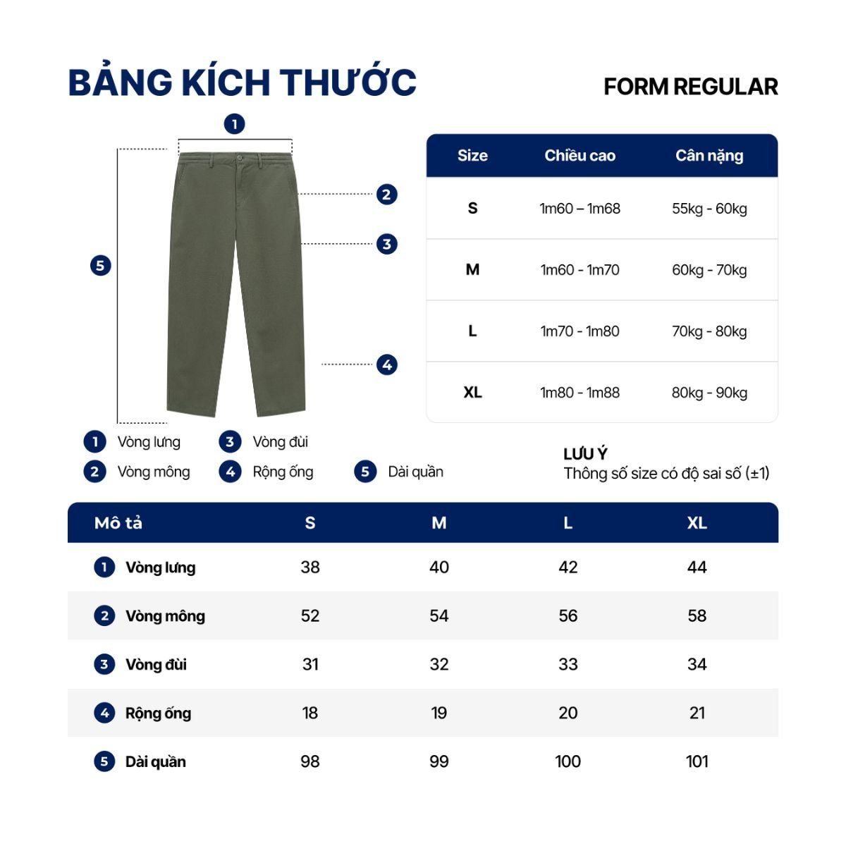Form regular giữ tỷ lệ cân đối giữa ống quần và chiều dài, giúp quần rũ nhẹ tự nhiên nhưng vẫn giữ dáng. Tính ứng dụng cao có thể phối cùng áo sơ mi linen, polo hoặc áo thun trơn cho outfit từ công sở đến dạo phố. Dáng quần thanh lịch giúp chuyển đổi linh hoạt giữa phong cách smart casual và resort look hiện đại.