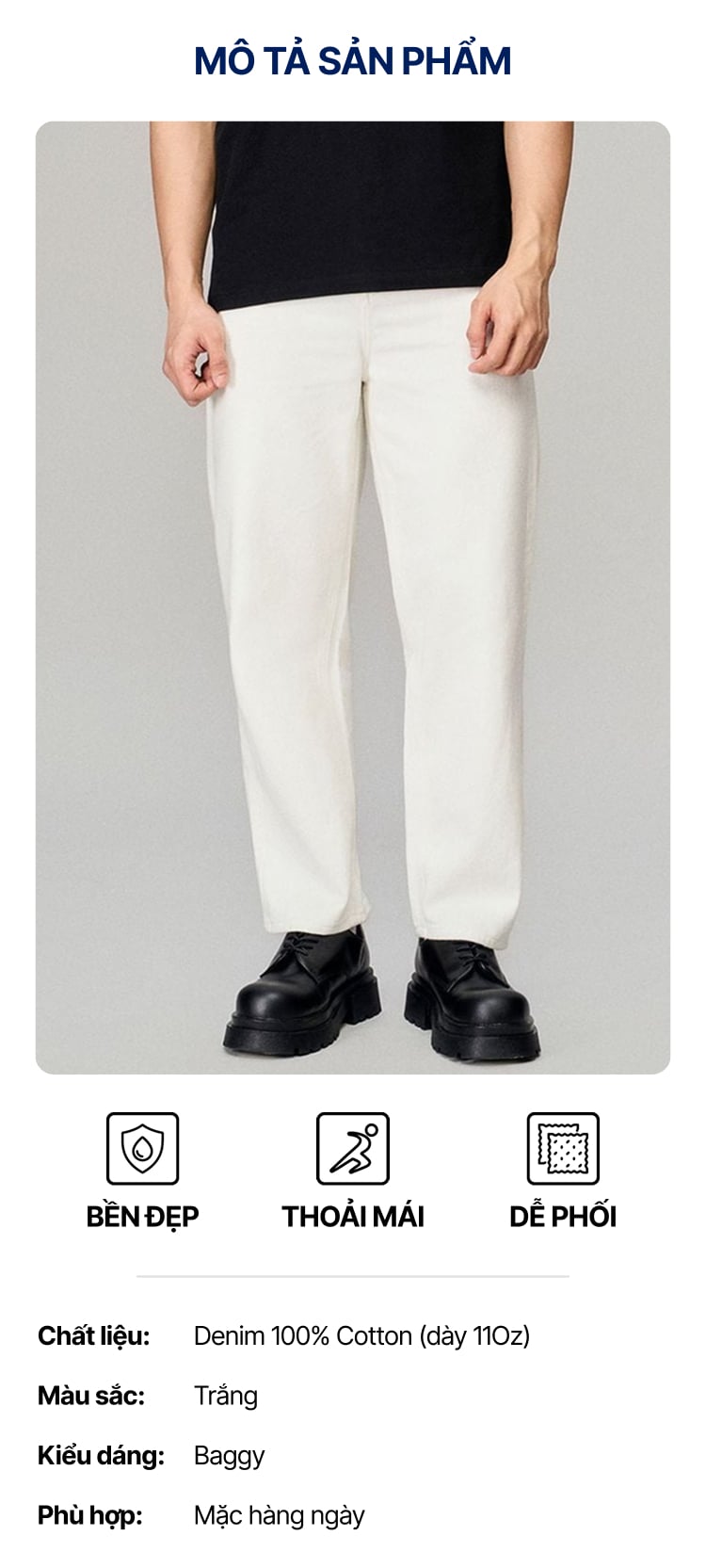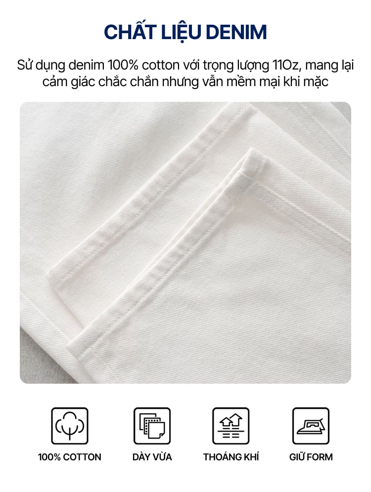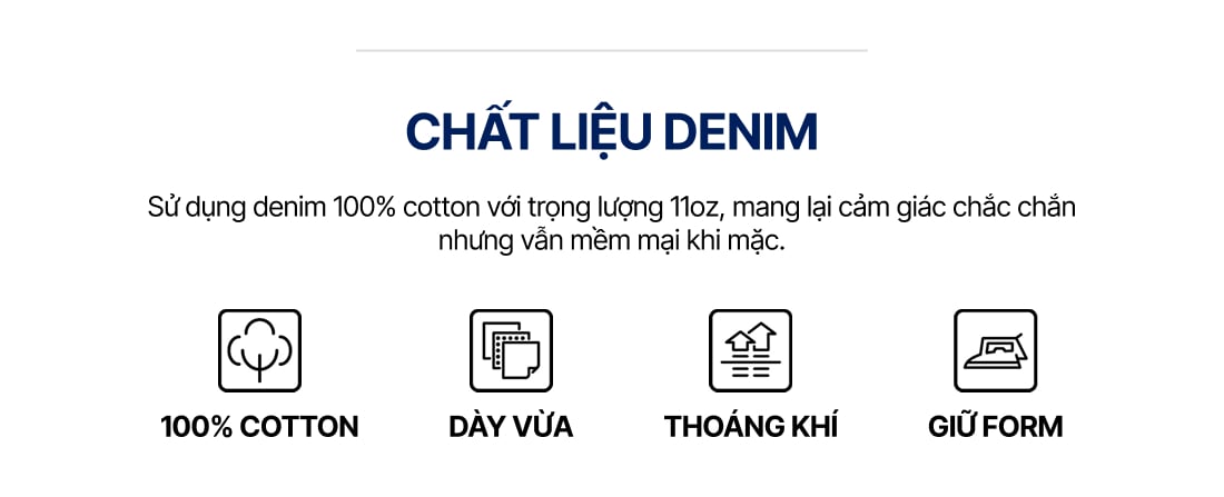 • Chất liệu: Denim 100% Cotton (dày 11Oz)