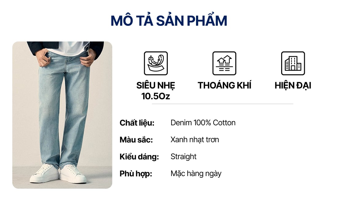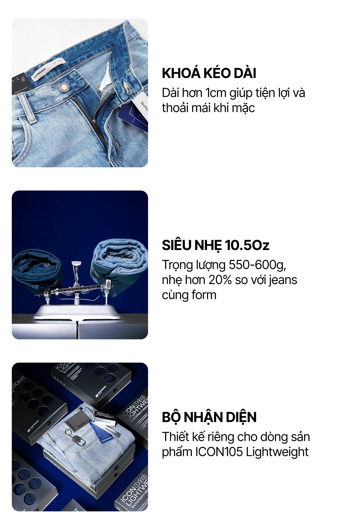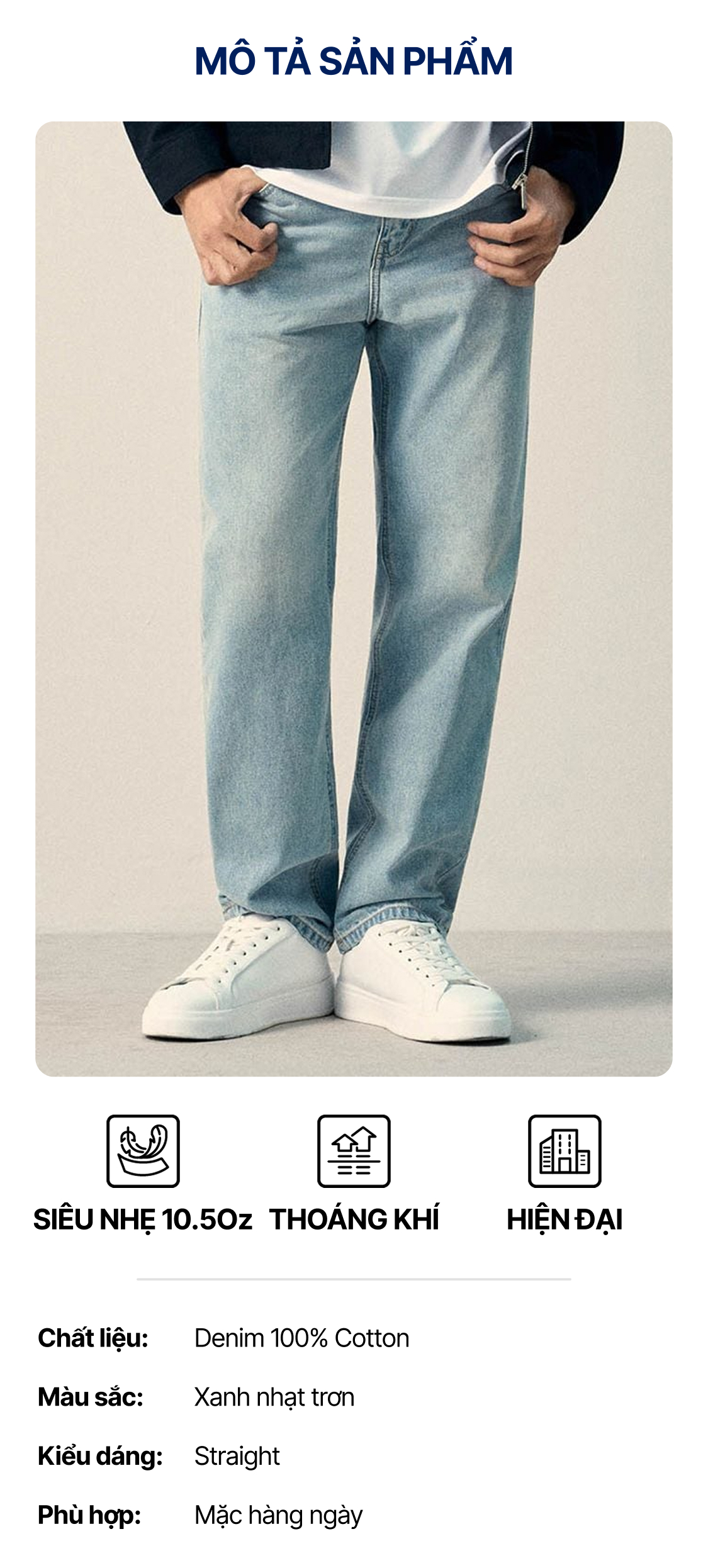 Quần Jean Nam Siêu Nhẹ Ống Suông Xanh Nhạt Trơn ICON105 Form Straight ƯU ĐÃI ONLINE