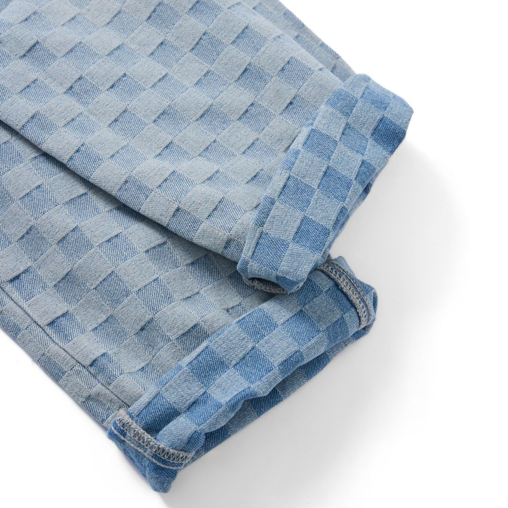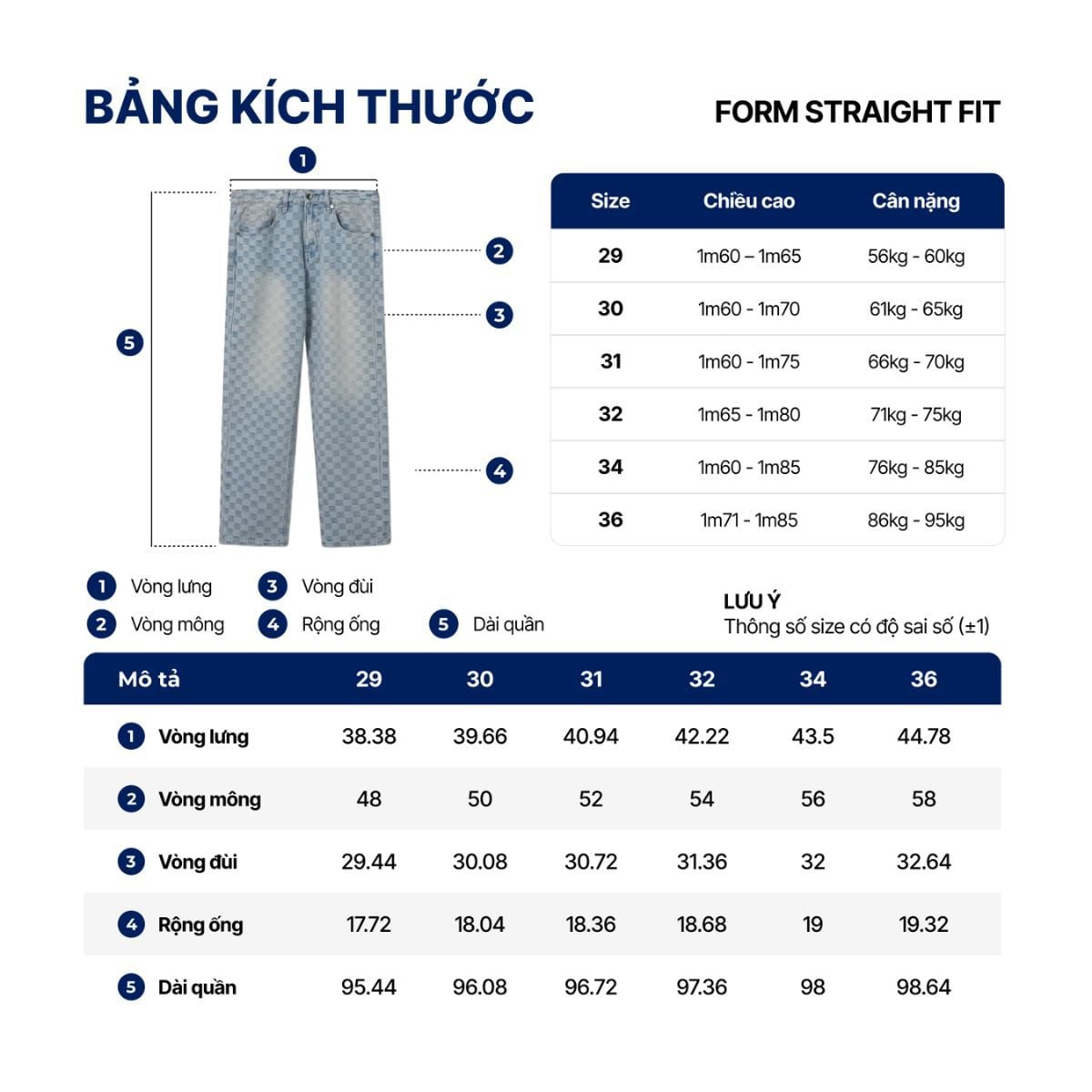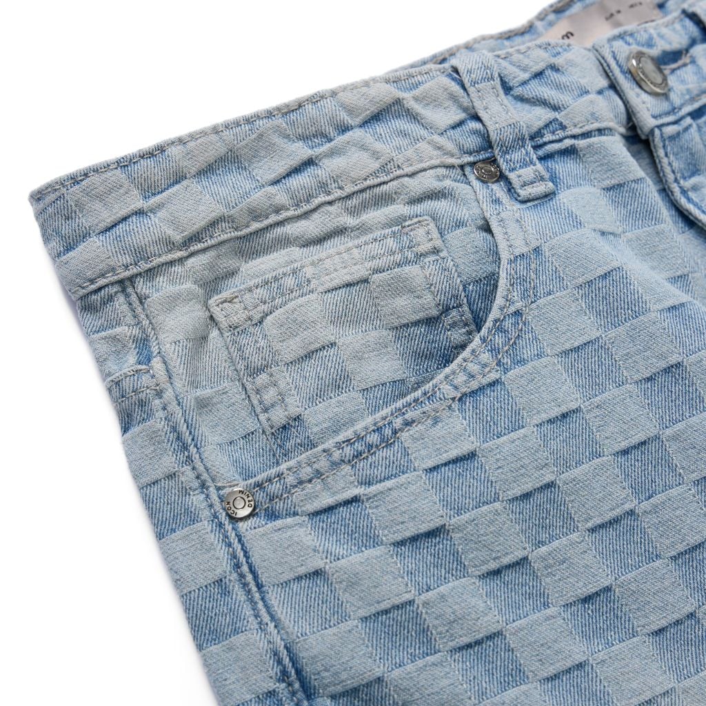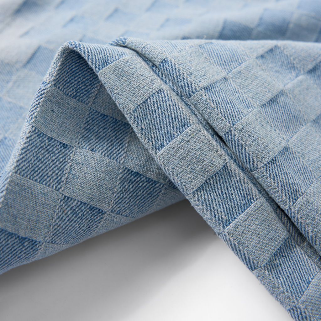 Quần jean ấn tượng với gam xanh nhạt hiện đại, kết hợp họa tiết jacquard dệt ô vuông độc đáo, tạo hiệu ứng thị giác bắt mắt. Sự kết hợp này mang đến vẻ ngoài thời thượng, hiện đại, giúp người mặc thể hiện cá tính riêng.