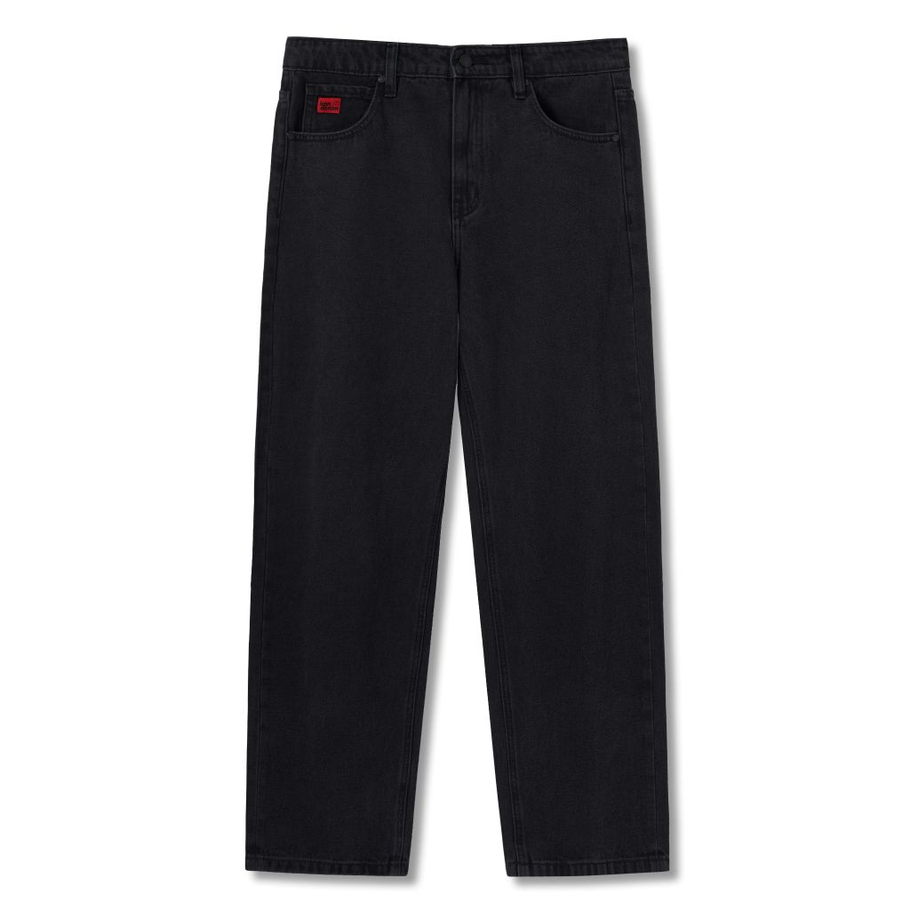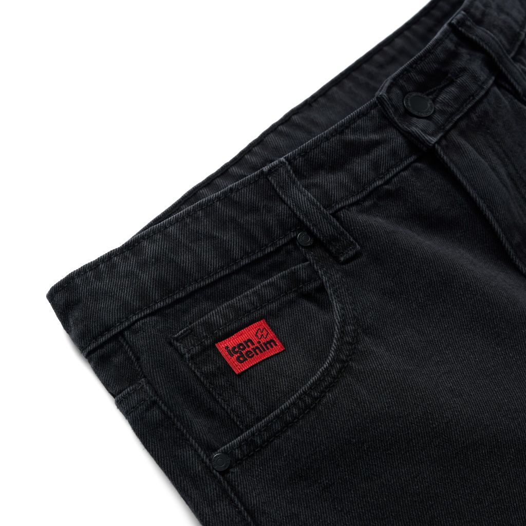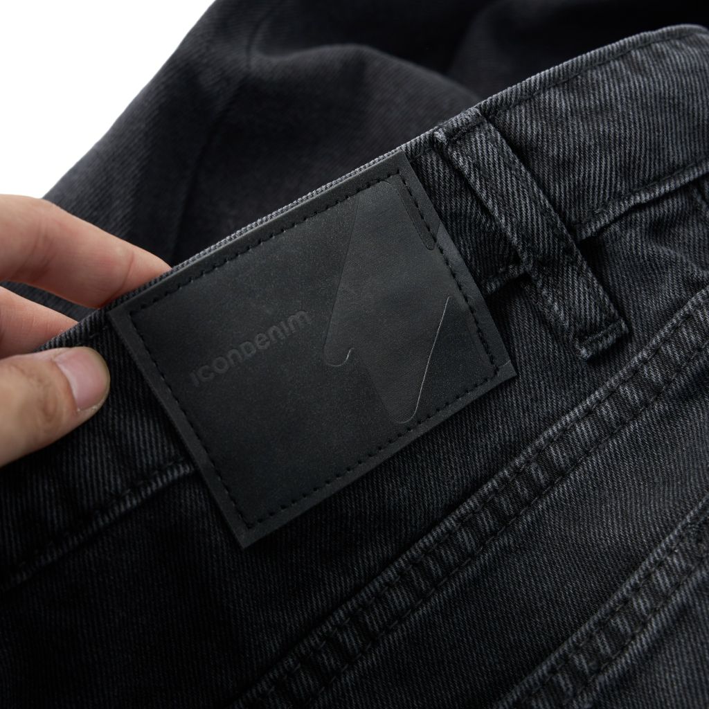 Quần jean gam xám đen thời thượng, nổi bật với tem dệt đỏ trên túi đồng hồ. Thiết kế trẻ trung, dễ phối với nhiều trang phục, từ áo sơ mi, polo đến áo thun năng động.