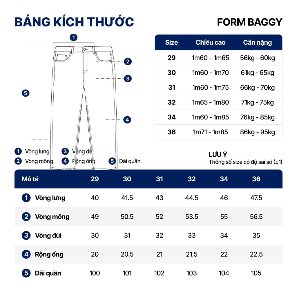 Form baggy với ống quần rộng từ đùi xuống gấu, mang lại sự thoải mái khi di chuyển và che khuyết điểm phần đùi, bắp chân. Dễ phối cùng áo thun oversized, áo sơ mi form rộng hoặc hoodie để mặc đi chơi, dạo phố hay phong cách street casual hằng ngày.
