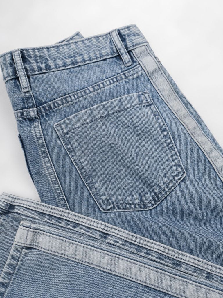 Thân chính phối vải hai bên hông mặt ngược, tạo đường viền nổi bật chạy dọc ống. Túi xéo hai bên hông phía trước, túi đắp góc vuông phía sau hoàn thiện đến từng chi tiết.