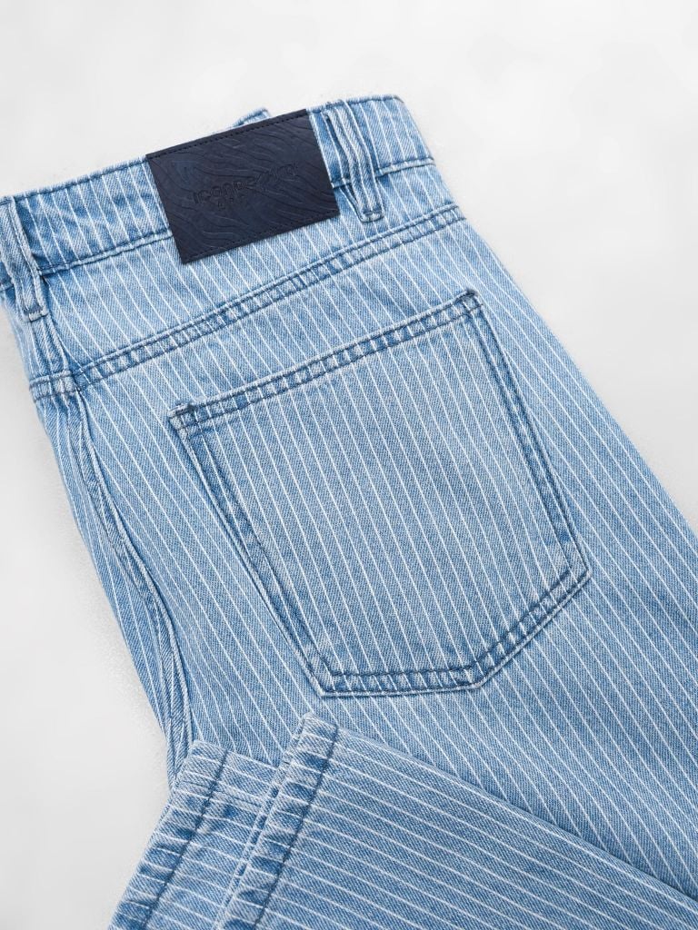 Sử dụng denim Jacquard 100% cotton với bề mặt dệt họa tiết sọc, tạo chiều sâu thị giác tự nhiên và khác biệt so với denim trơn. Vải giữ phom tốt, phù hợp sử dụng hằng ngày và dễ bảo quản.