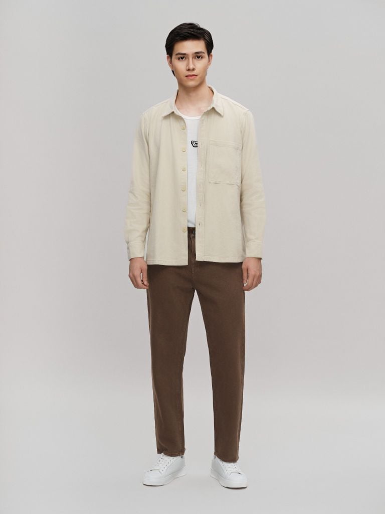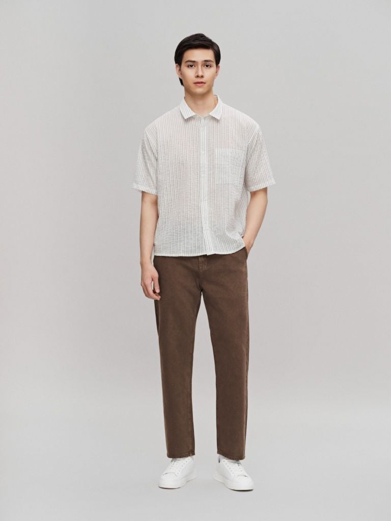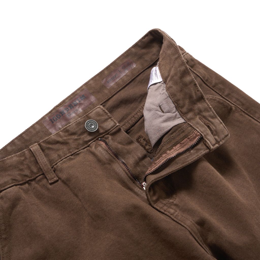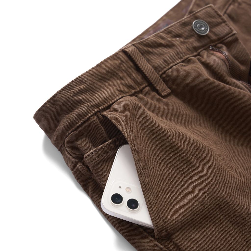 Vải kaki dày vừa, xử lý garment dye tạo nên tông màu nhuộm loang mộc mạc, đậm chất vintage nhưng vẫn hiện đại. Mỗi chiếc quần đều có sắc độ riêng biệt, tạo cảm giác cá tính và wear-in tự nhiên. Lớp lót túi và lưng cùng tone giúp tổng thể đồng bộ và cao cấp hơn.