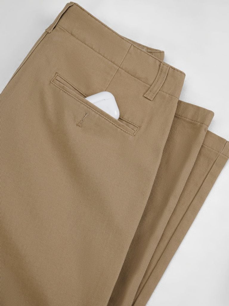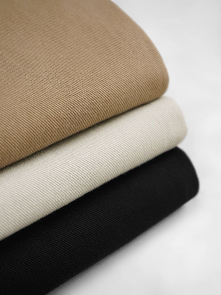 Vải khaki twill 100% cotton có bề mặt dệt chéo chắc tay, giữ form ổn định và lên dáng gọn gàng khi mặc, đồng thời vẫn đảm bảo độ thoáng khí và cảm giác dễ chịu cho nhu cầu sử dụng hằng ngày.