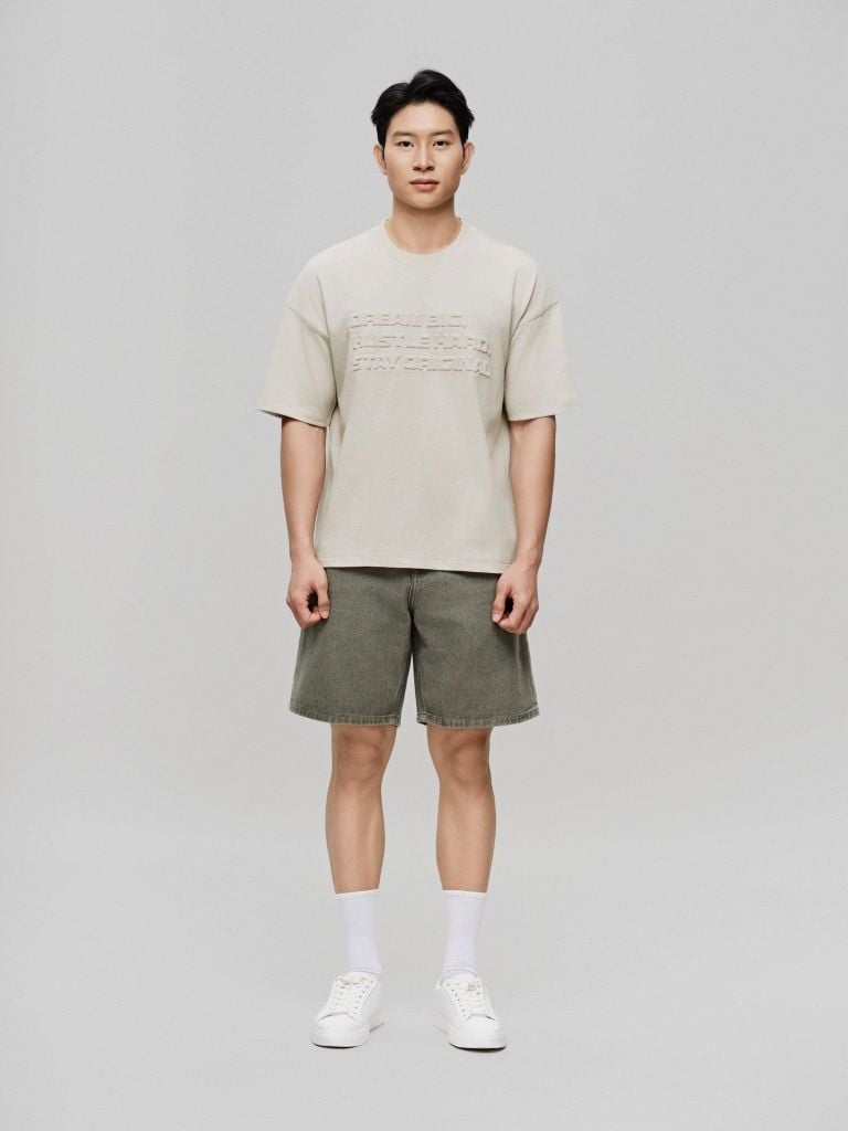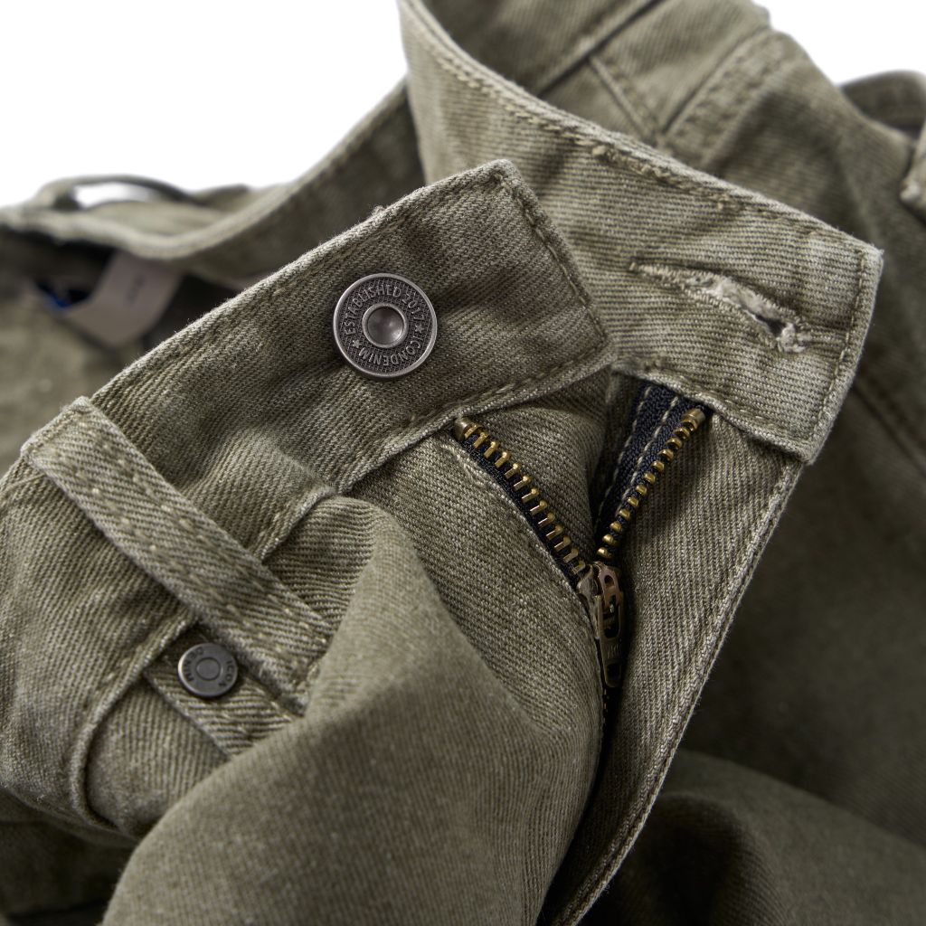 Đường may sắc nét gam màu rêu tint wash lộ rõ bề mặt vải loang tinh tế, tạo cảm giác mạnh mẽ nhưng không quá gắt.