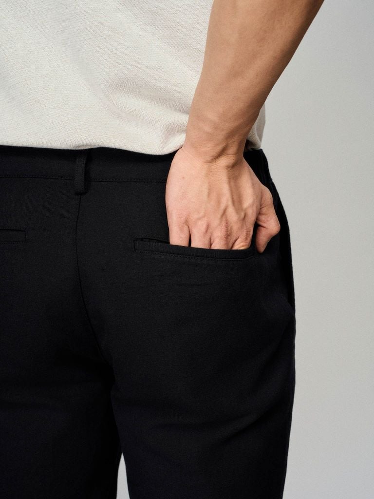 Phần lưng liền tích hợp thun rút được xử lý tỉ mỉ, tạo độ ôm vừa vặn. Hai túi xéo phía trước và túi cơi phía sau được bố trí cân đối, passan cố định chắc chắn giúp giữ form ổn định, trong khi toàn bộ quần được hoàn thiện bằng các đường may 1 kim – 2 kim tỉ mỉ, tăng độ bền và tạo cảm giác mặc nhẹ, tự nhiên.