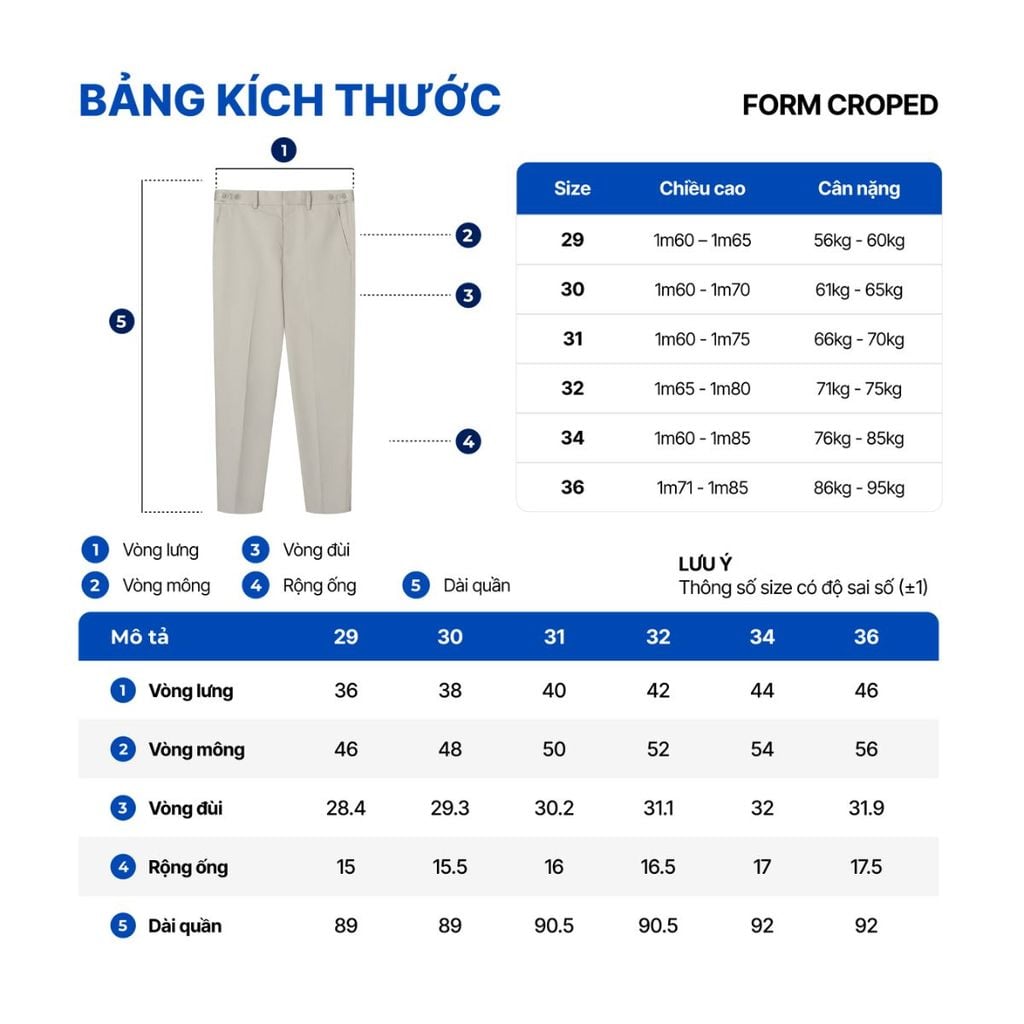 Form quần tây crop mang đến vẻ ngoài hiện đại, thanh lịch nhưng vẫn trẻ trung và phóng khoáng. Với độ dài lửng trên mắt cá chân, thiết kế giúp tạo hiệu ứng kéo dài chân và làm tổng thể trang phục trở nên cân đối, thời thượng.