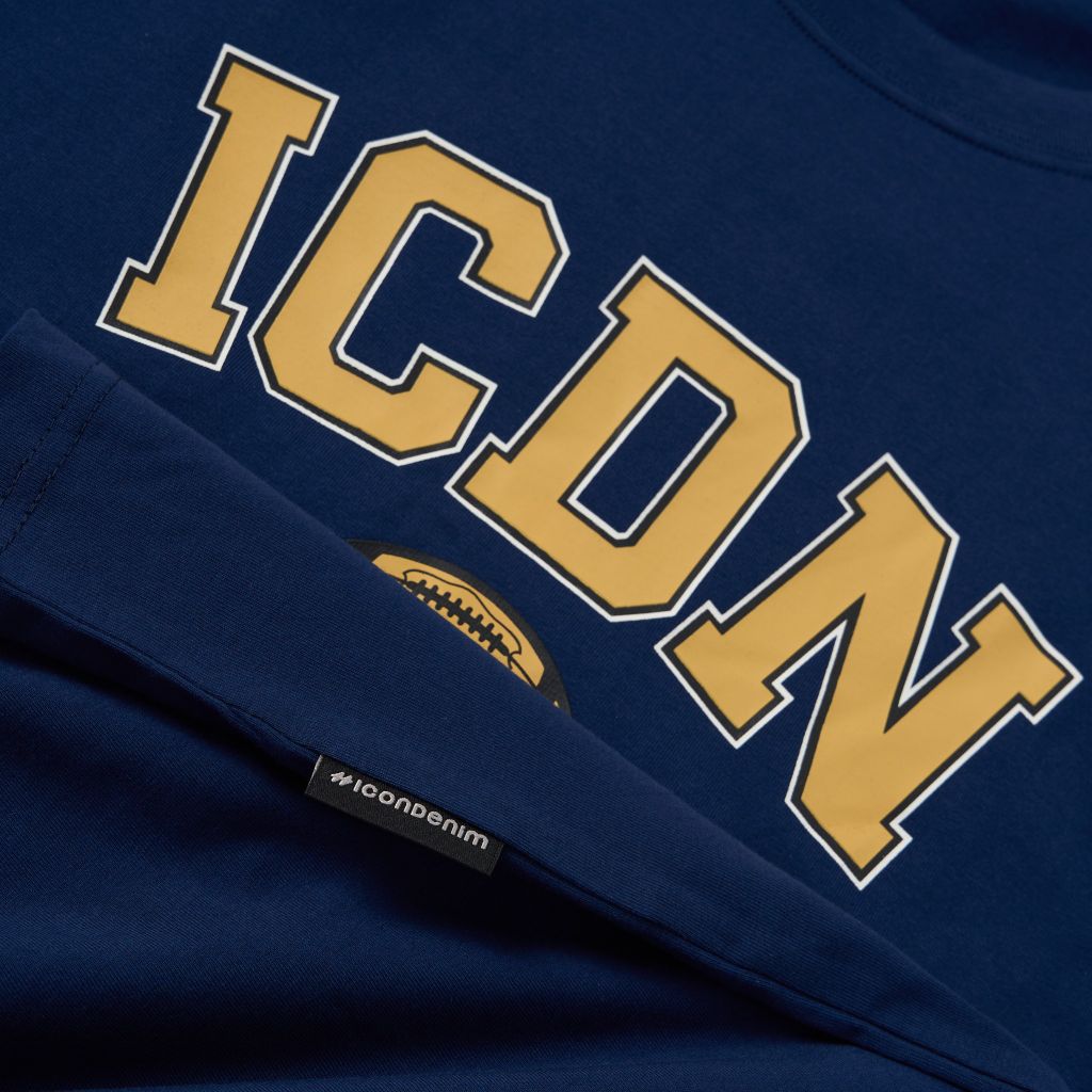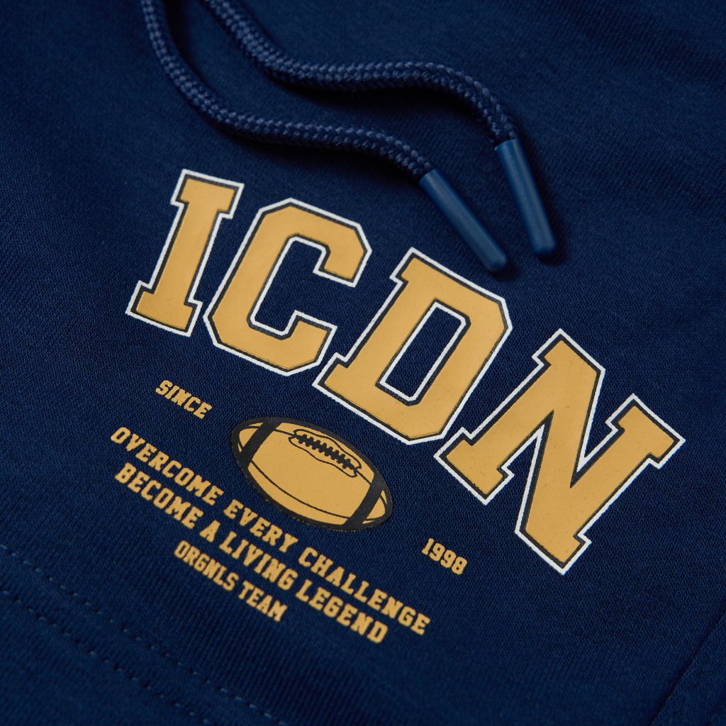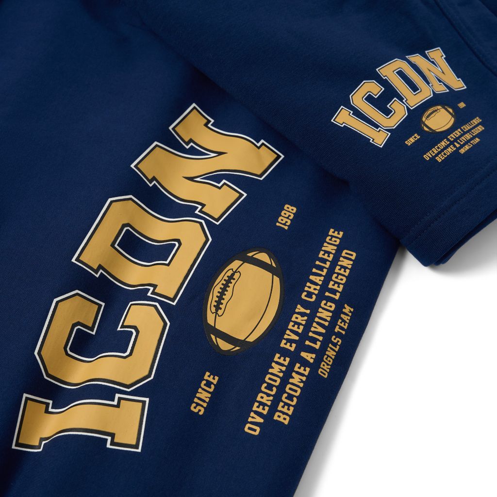 Thiết kế nổi bật với họa tiết in cao và in dẻo lấy cảm hứng từ bóng bầu dục, kết hợp chữ “ICDN” cá tính trên nền xanh đậm. Chi tiết lưng quần lót thun và túi tiện dụng giúp hoàn thiện phong cách trẻ trung và năng động.