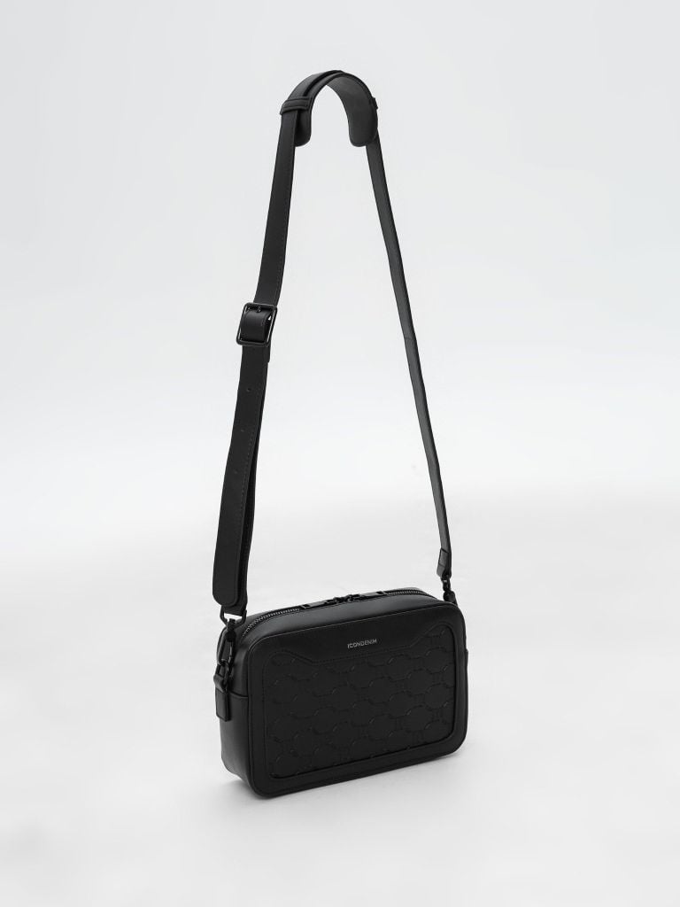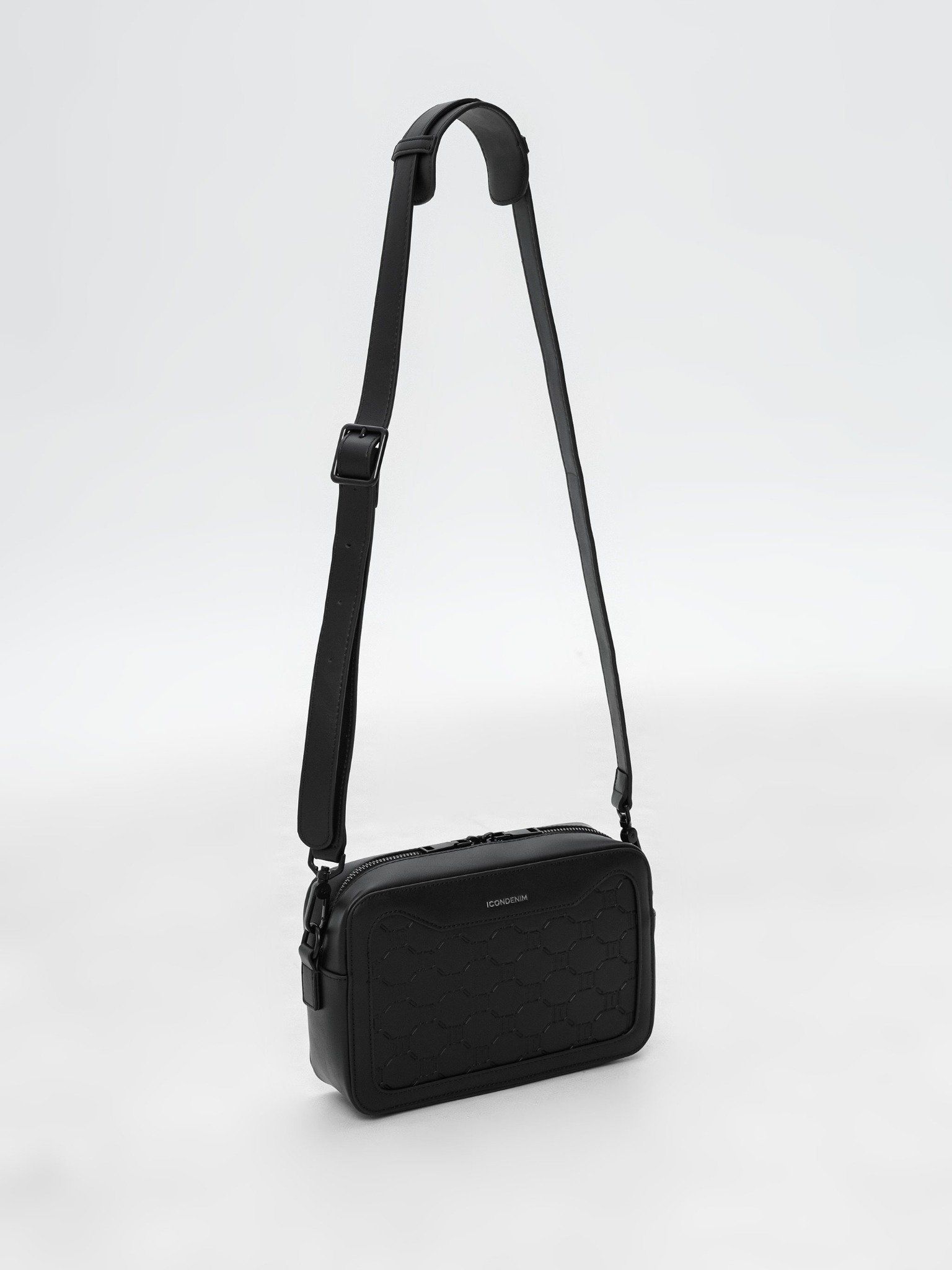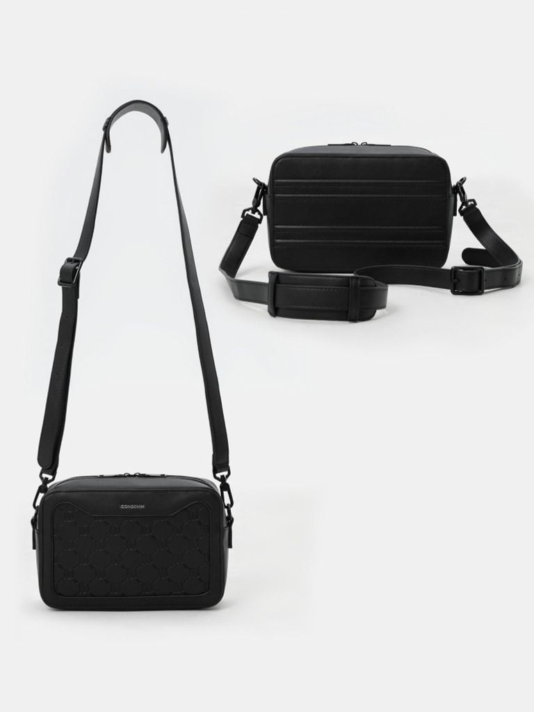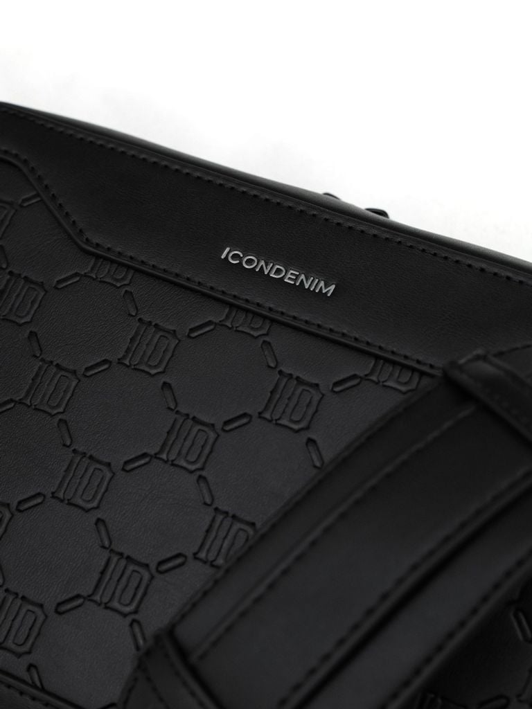 Mặt trước sử dụng pattern ID dập nổi tinh gọn, kết hợp mảng da trơn mang lại cảm giác hiện đại, cá tính nhưng không phô trương. Các chi tiết viền, ráp mí và bo góc được may kín, hạn chế nhăn và tạo hiệu ứng phẳng mượt. Khóa kéo kim loại màu đen, khoen D và tăng đơ cùng tông tạo tổng thể sắc nét.