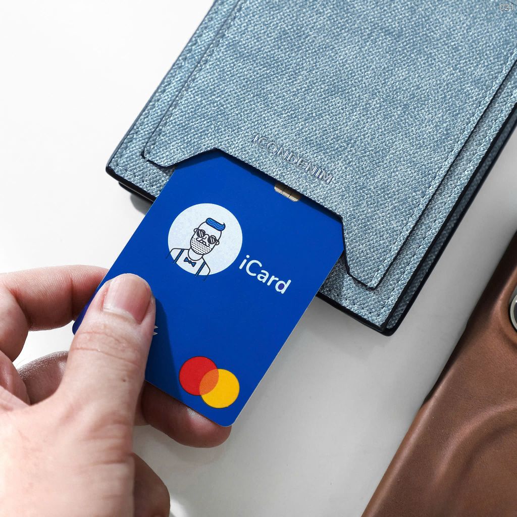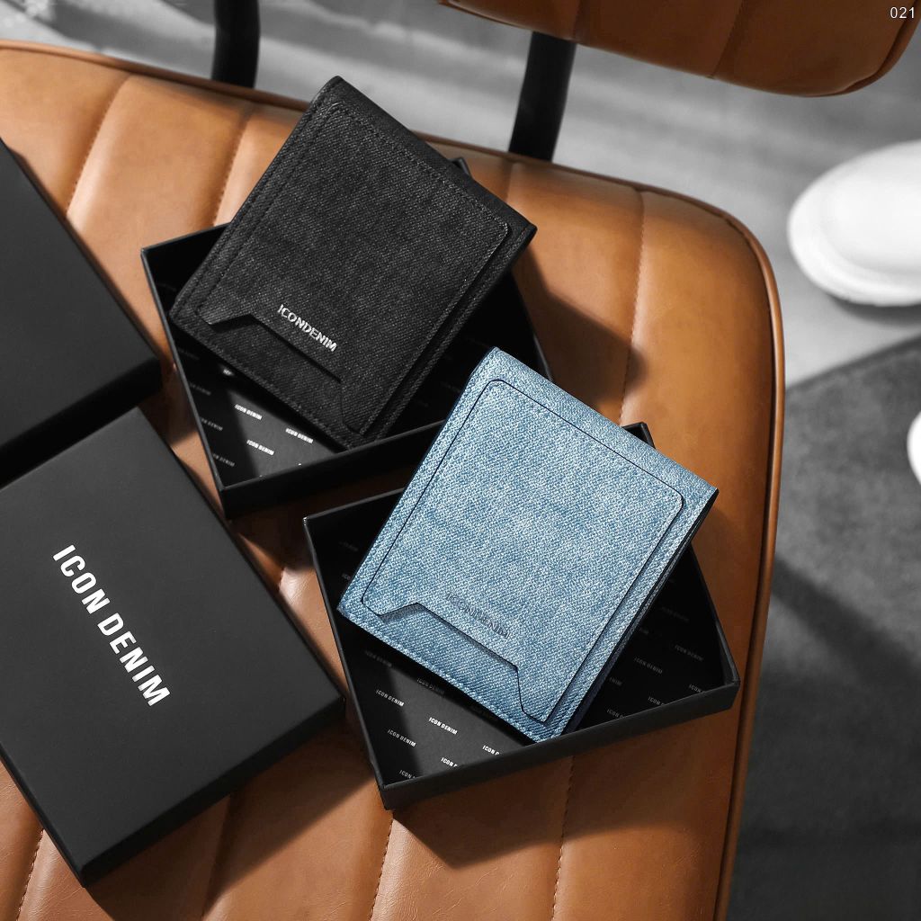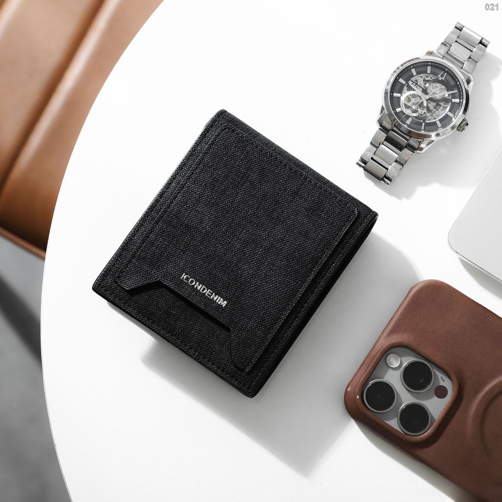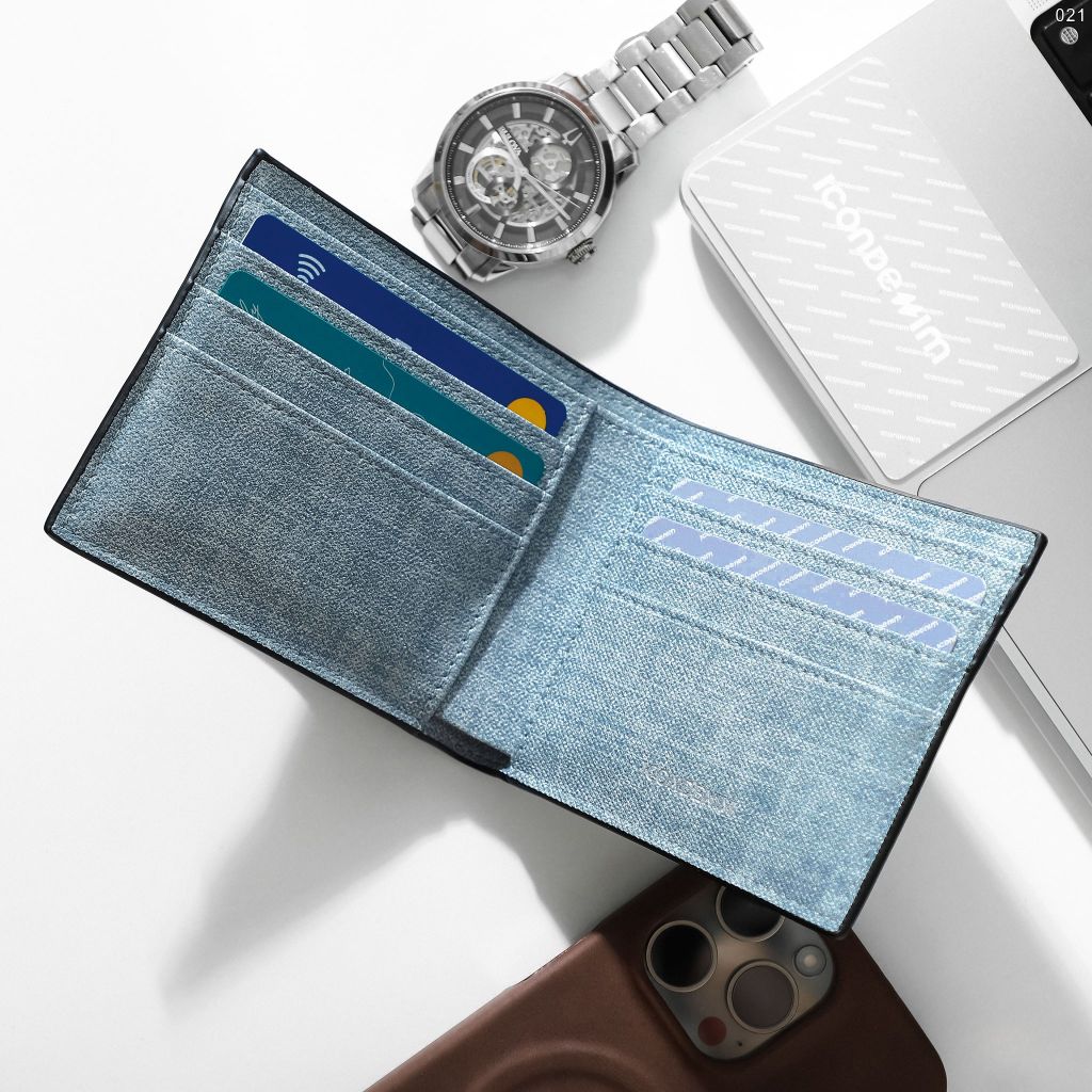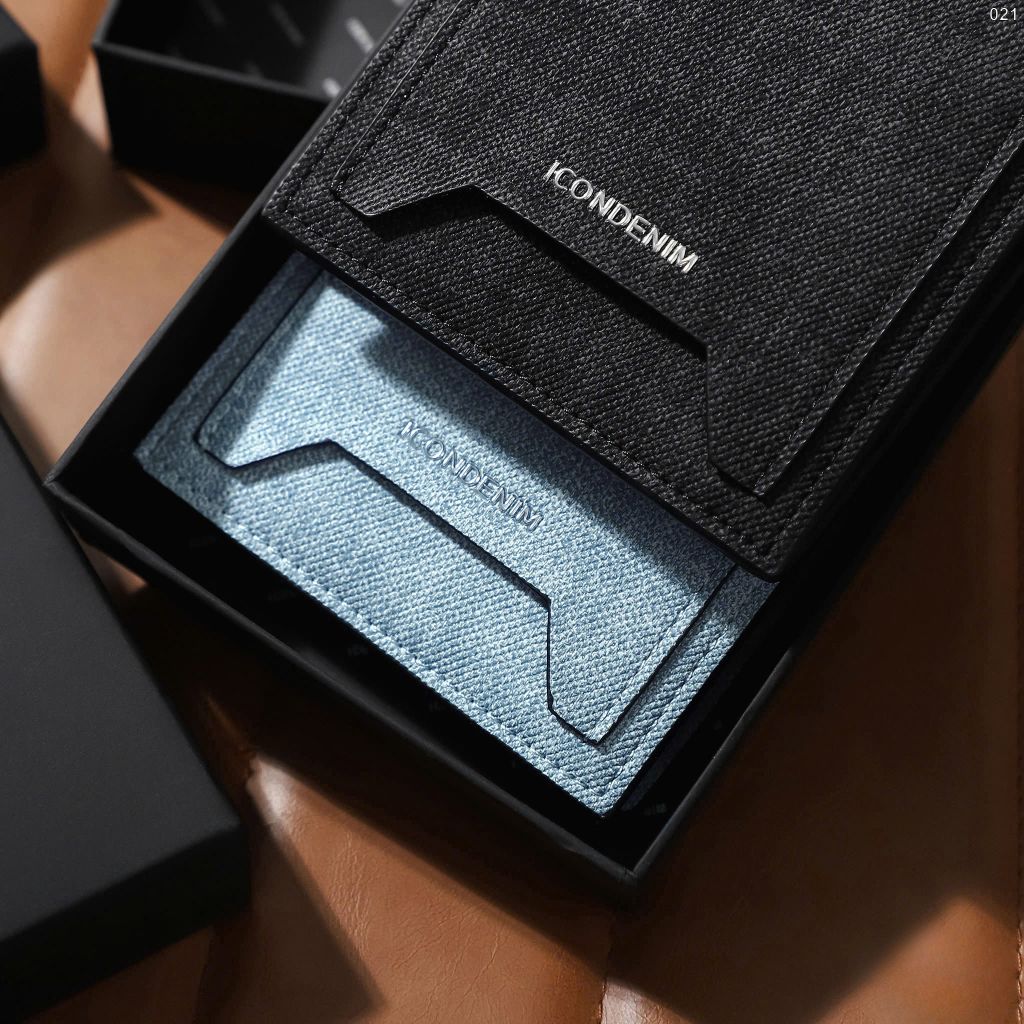 Ví với họa tiết vân chéo và wash đặc trưng, phối màu xanh xám trẻ trung, cá tính. Logo kim loại ICONDENIM và ngăn thẻ ngoài ví không chỉ tiện lợi mà còn tạo điểm nhấn phong cách.