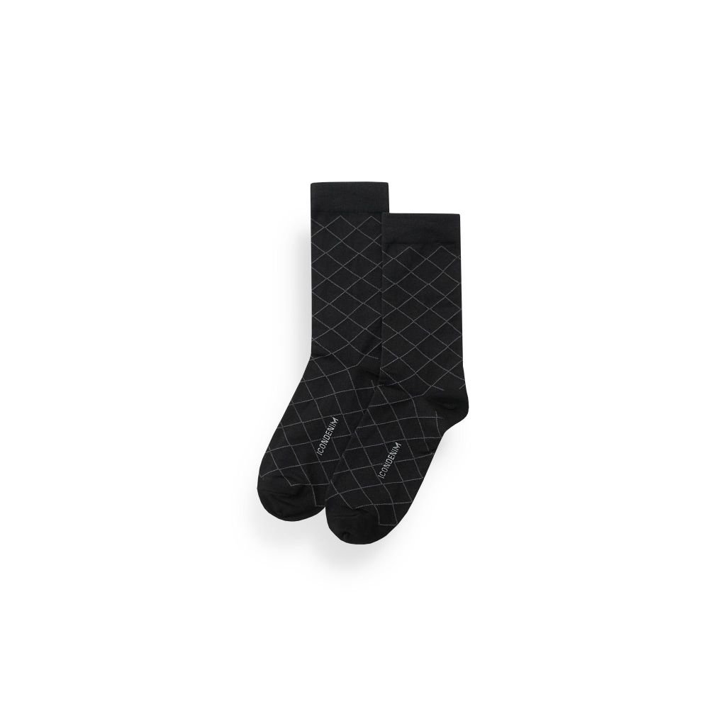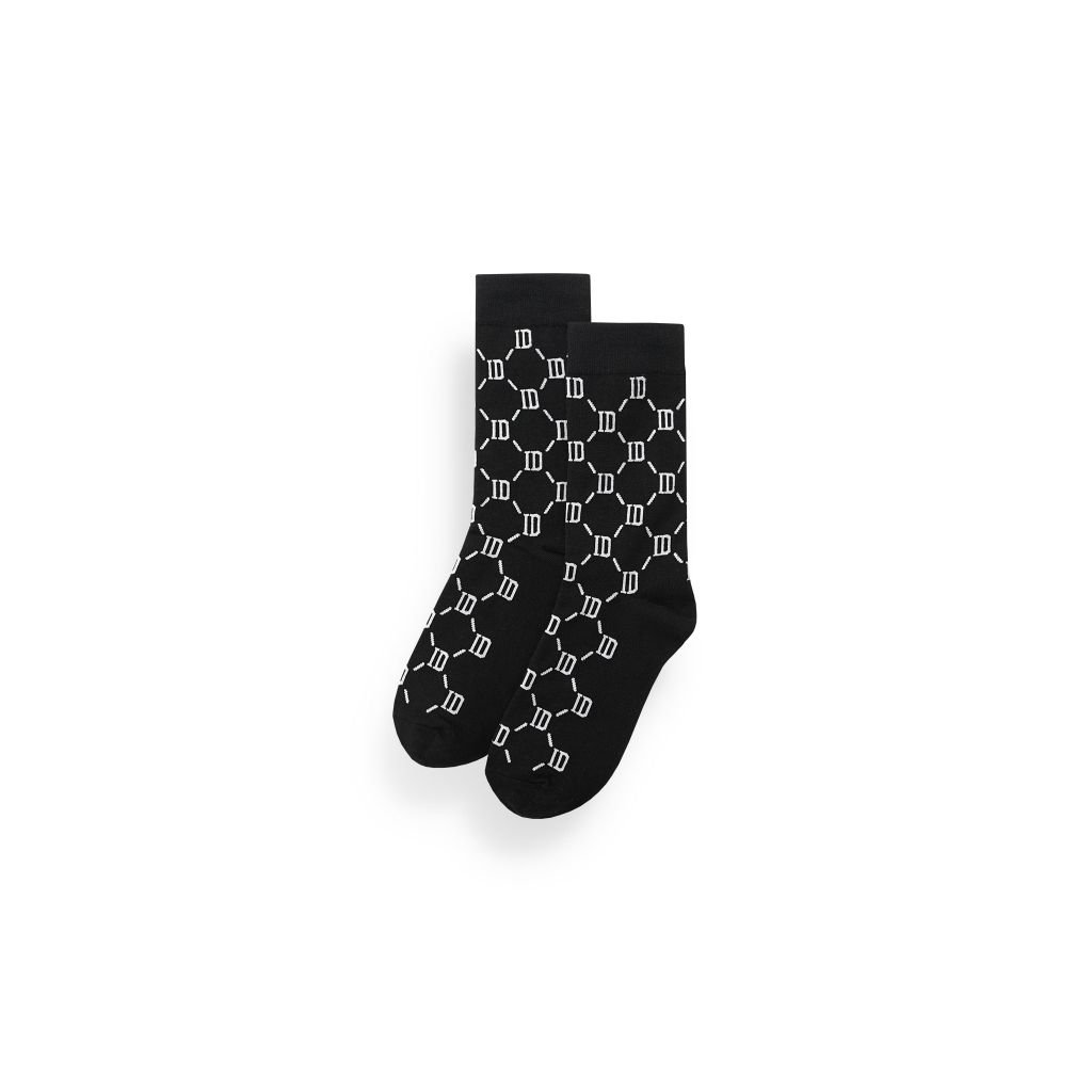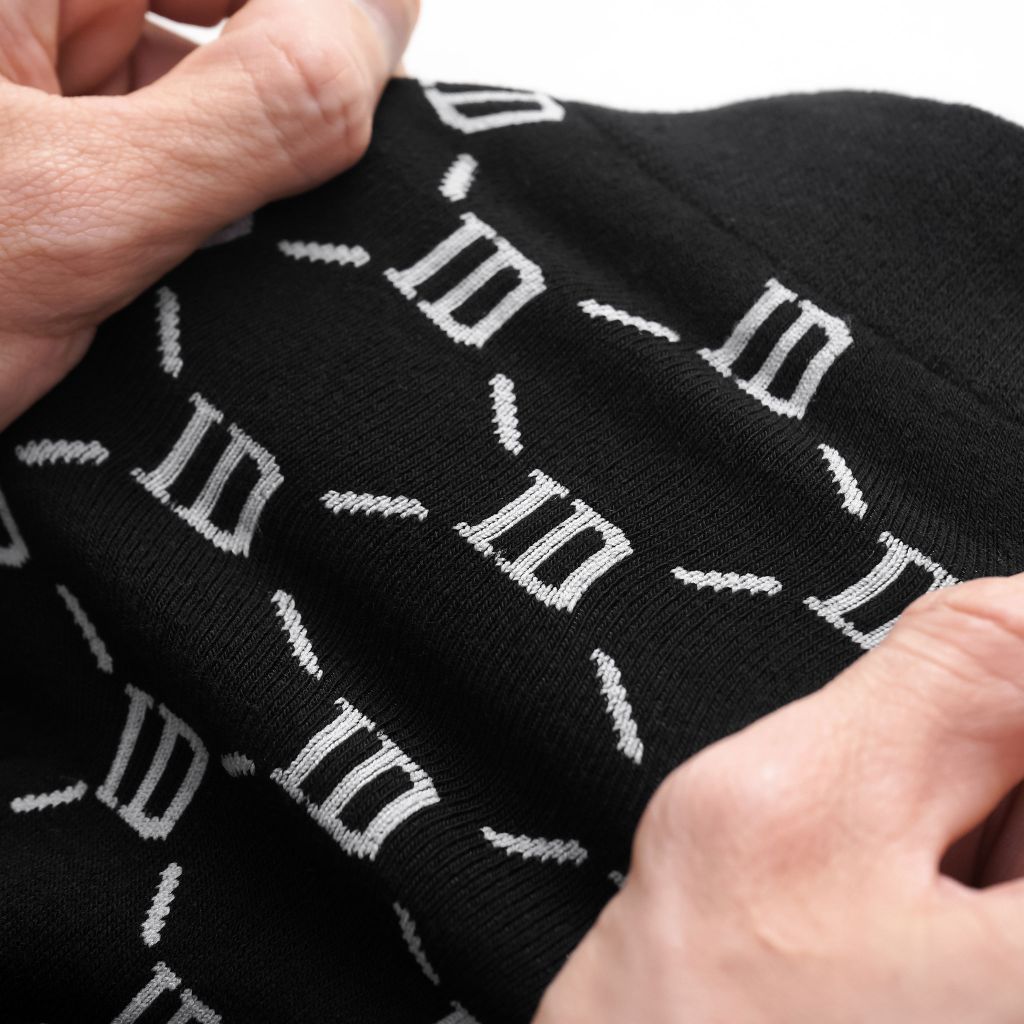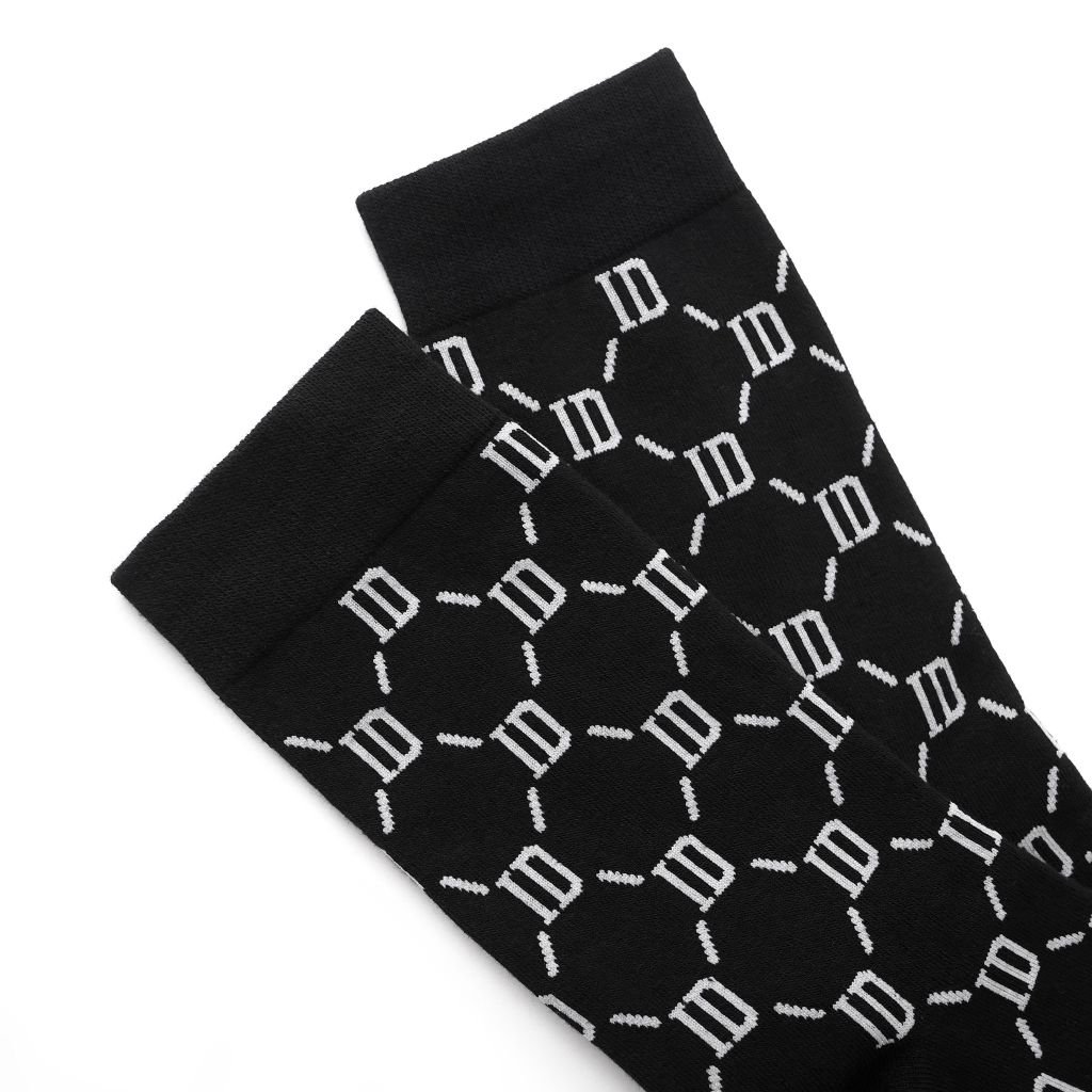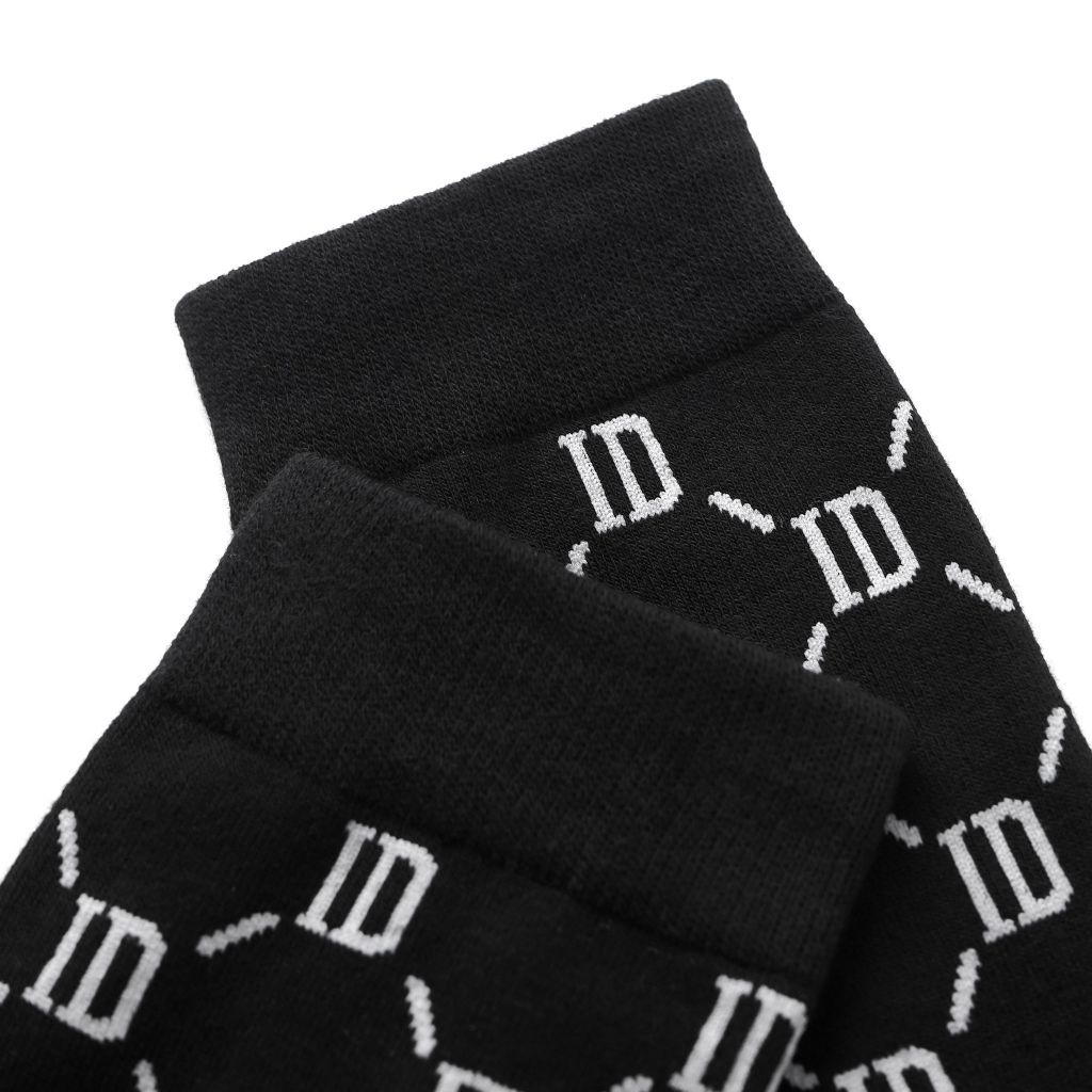 Vớ đen cá tính với 5 họa tiết hình học thời trang: logo ICDN cách điệu, sọc trắng, sọc dọc, lưới mắt xích ID, chấm bi và caro, tạo điểm nhấn tinh tế khi phối cùng giày tây. Thẻ bài đính kèm giúp người dùng hiểu rõ hơn về tính năng và công dụng sản phẩm.